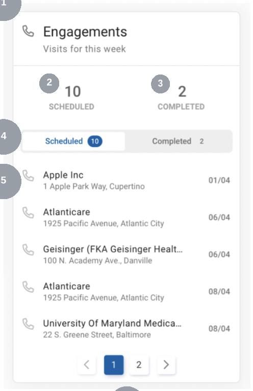 The engagement widget shows the planned engagements for the coming week. The widget helps sales representatives plan their week accordingly and complete the required tasks.