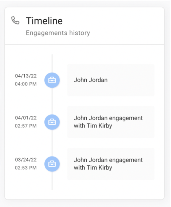 The timeline widget allows a Sales representative to see a timeline of all past and planned engagements with a customer. The sales representative can see past customer interactions, materials shared, and any past interactions planned with a customer.