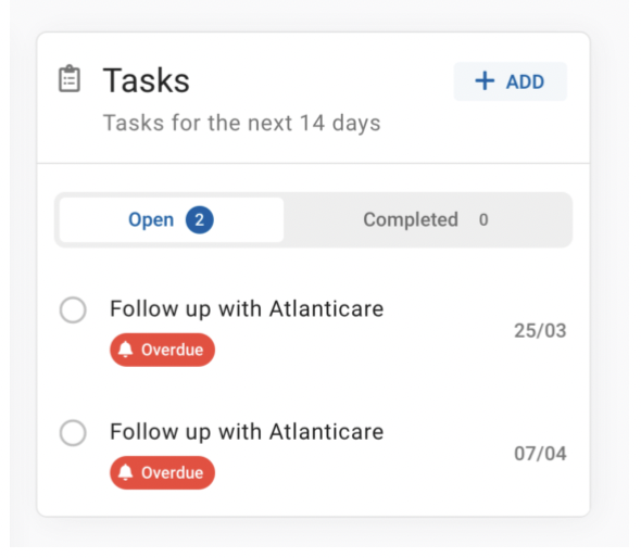 The task widget shows the tasks assigned to a sales representative for the next three weeks. Similar to the engagements widget, this widget was designed to help the sales representatives plan their week accordingly.