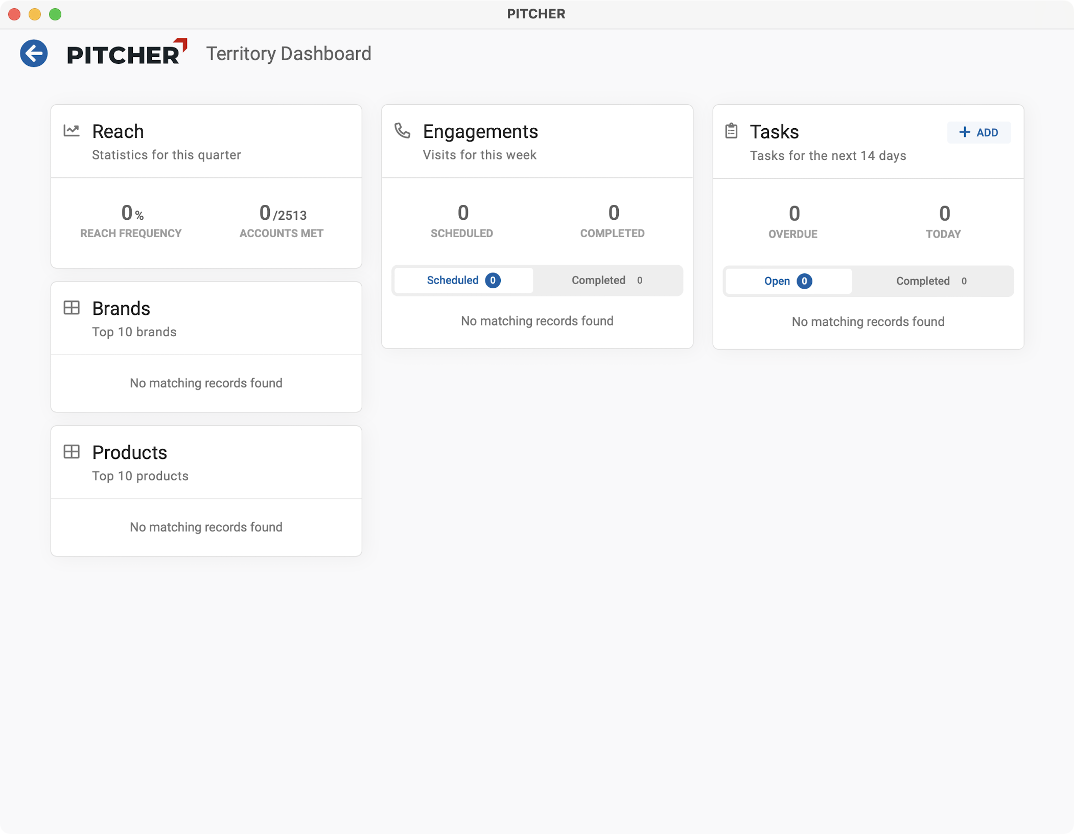 The territory dashboard is presented to you by default upon first accessing the application and is the only dashboard available for sales representatives.