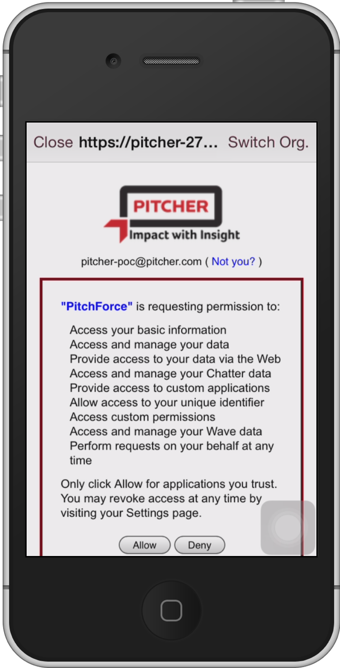 Make sure you're connecting to the correct org (sandbox / production), enter your credentials, and tap Allow.