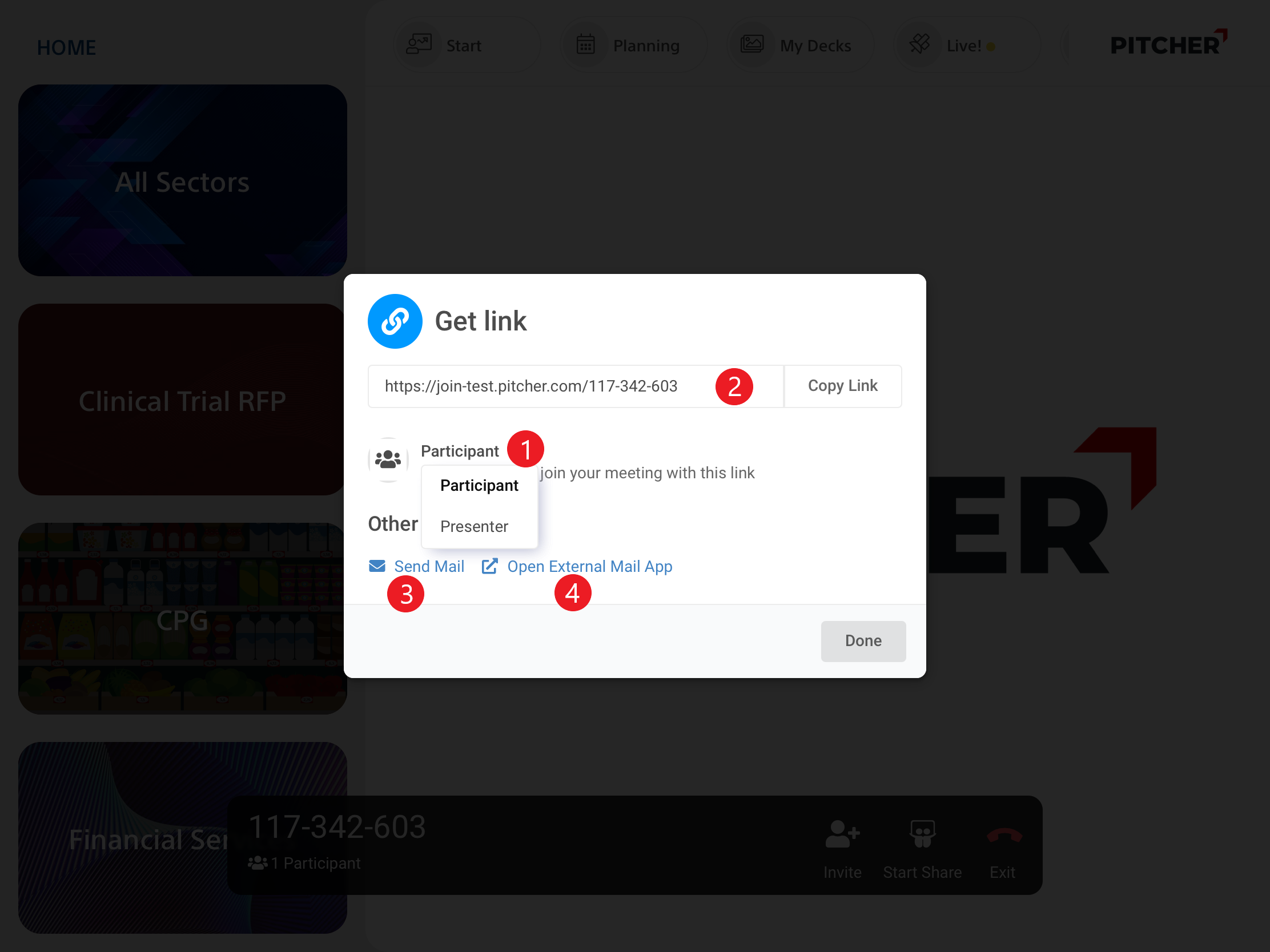 Select Participant or Presenter from the dropdown in the Invite dialogue. By default, the Participant option is selected. It will generate a joining link for the participants.