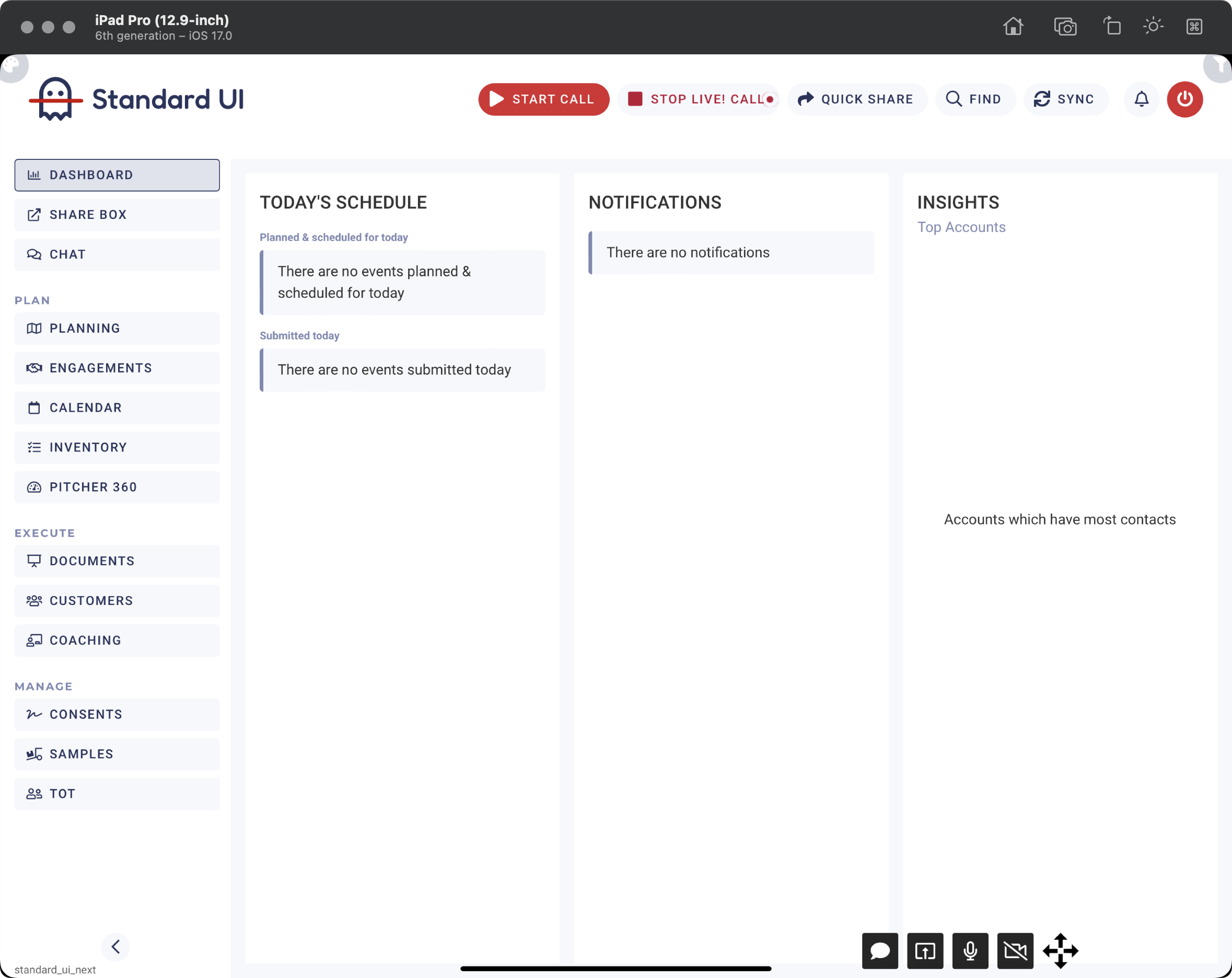 Live Controls - It is part of Impact iOS UI. This part is the control panel for the host. The host can start/stop/share the meeting and share the screen from here. The host can also open the text chat. Sharing the screen is done by the native app but is triggered by the controls.