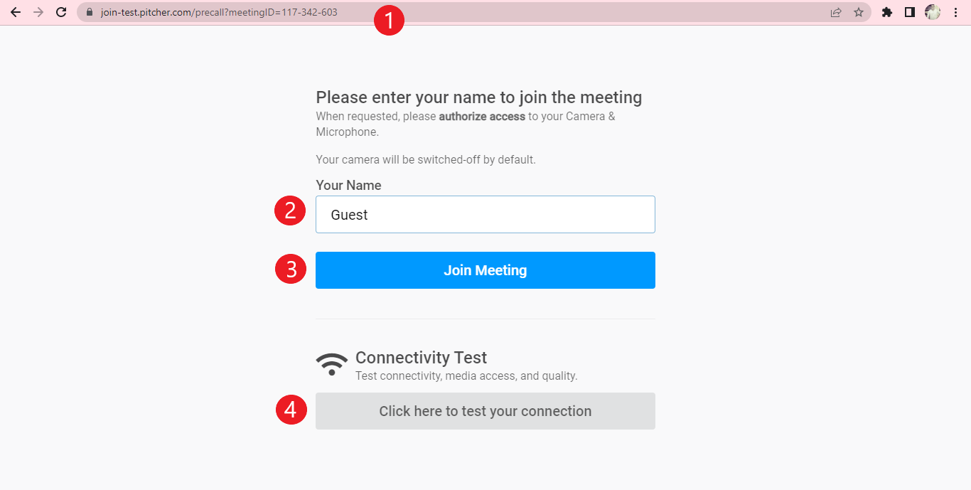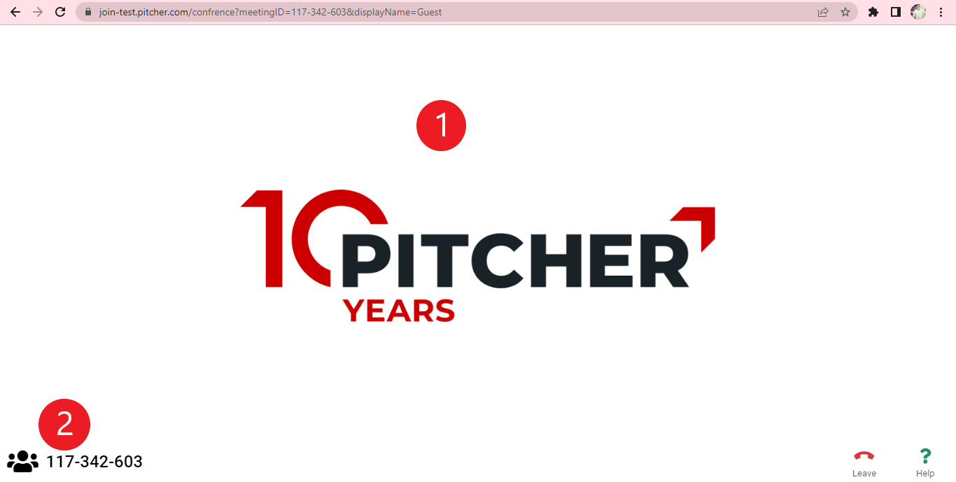 When you send an invite with the meeting link to participants who have clicked that link, they will be taken to the 'Pitcher Join' page. The Meeting ID is displayed in the link (URL).