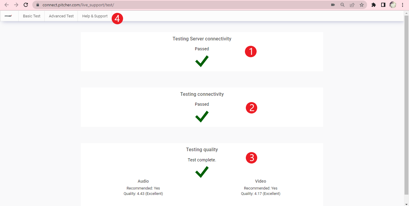 Testing quality: Checks if video and audio quality (speed) are good enough to run a Live! session.