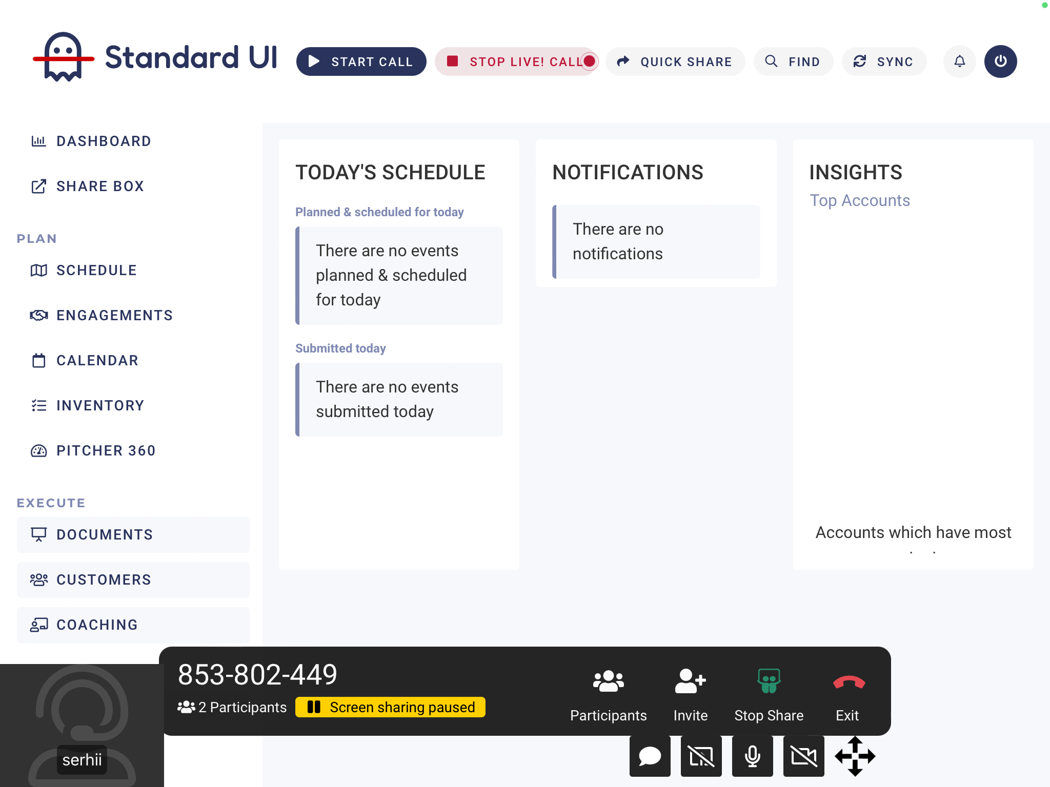 Pitcher Impact Live! is a remote meeting application from Pitcher that allows Sales Reps to schedule internet-based remote calls with customers. Pitcher Impact Live has the following features: