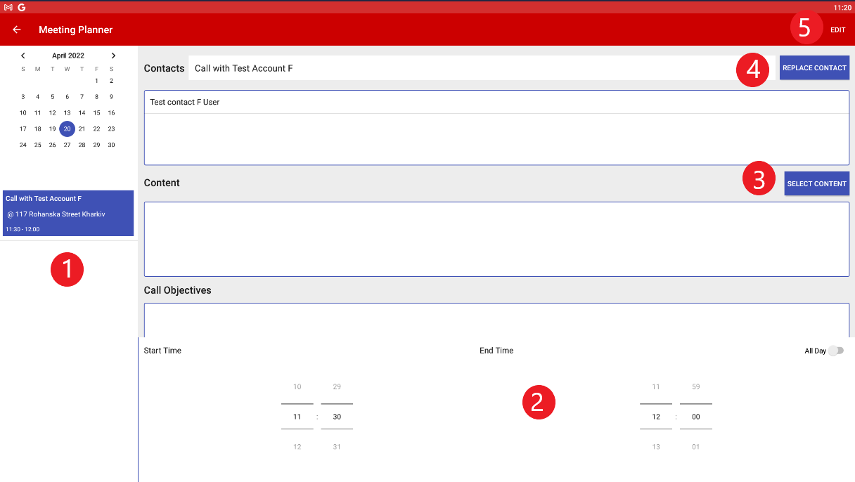 Tap on any content in the window and the content will appear in the selected list in the pre-call or planning view. Once the contact and content has been selected, set the start date and end time. If the call is intended to happen for the entire day use the All Day slider and it will select by default 8 hours starting with 9 am as default time.