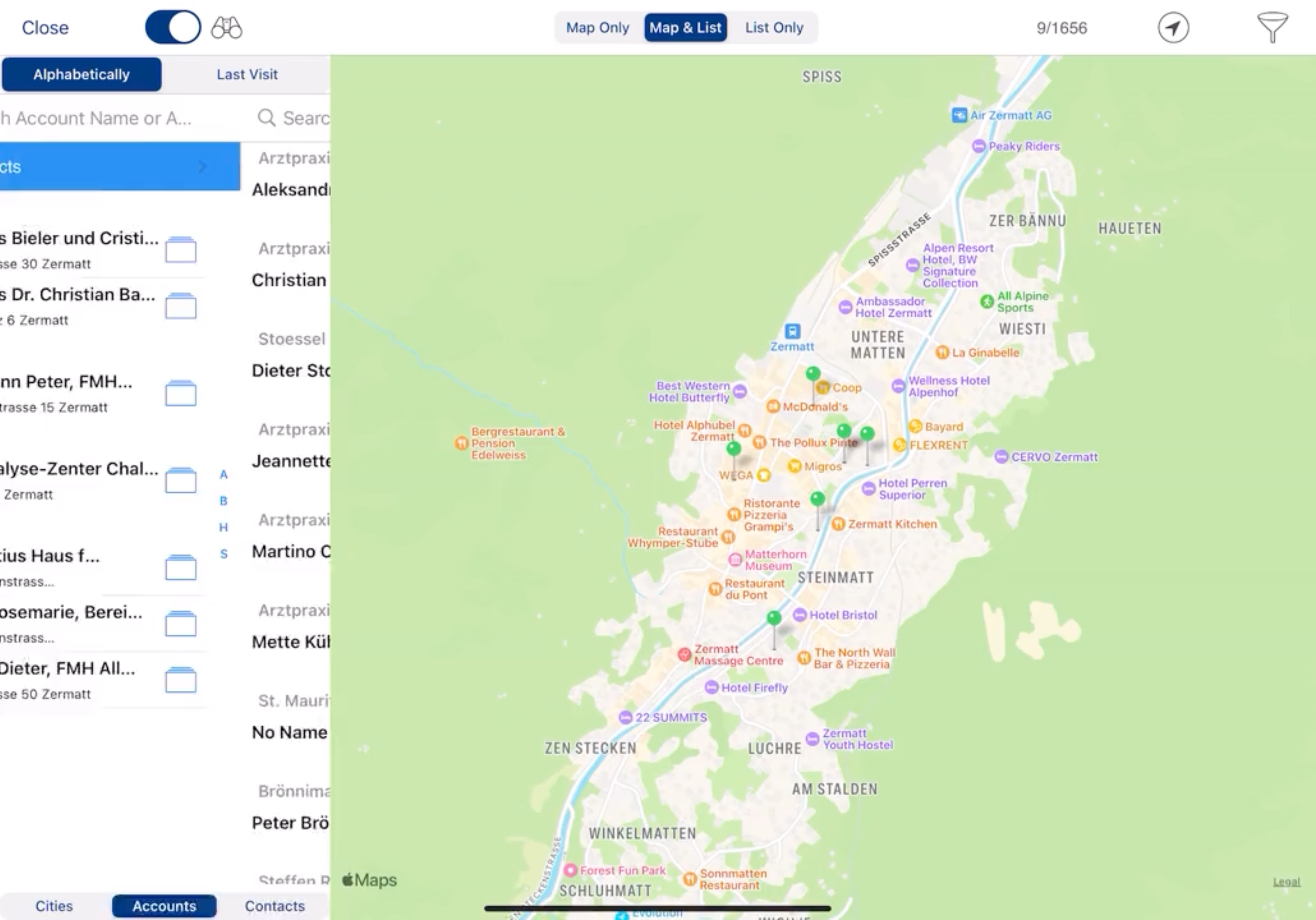 Navigate on the map to see pins corresponding to the locations of accounts/contacts.