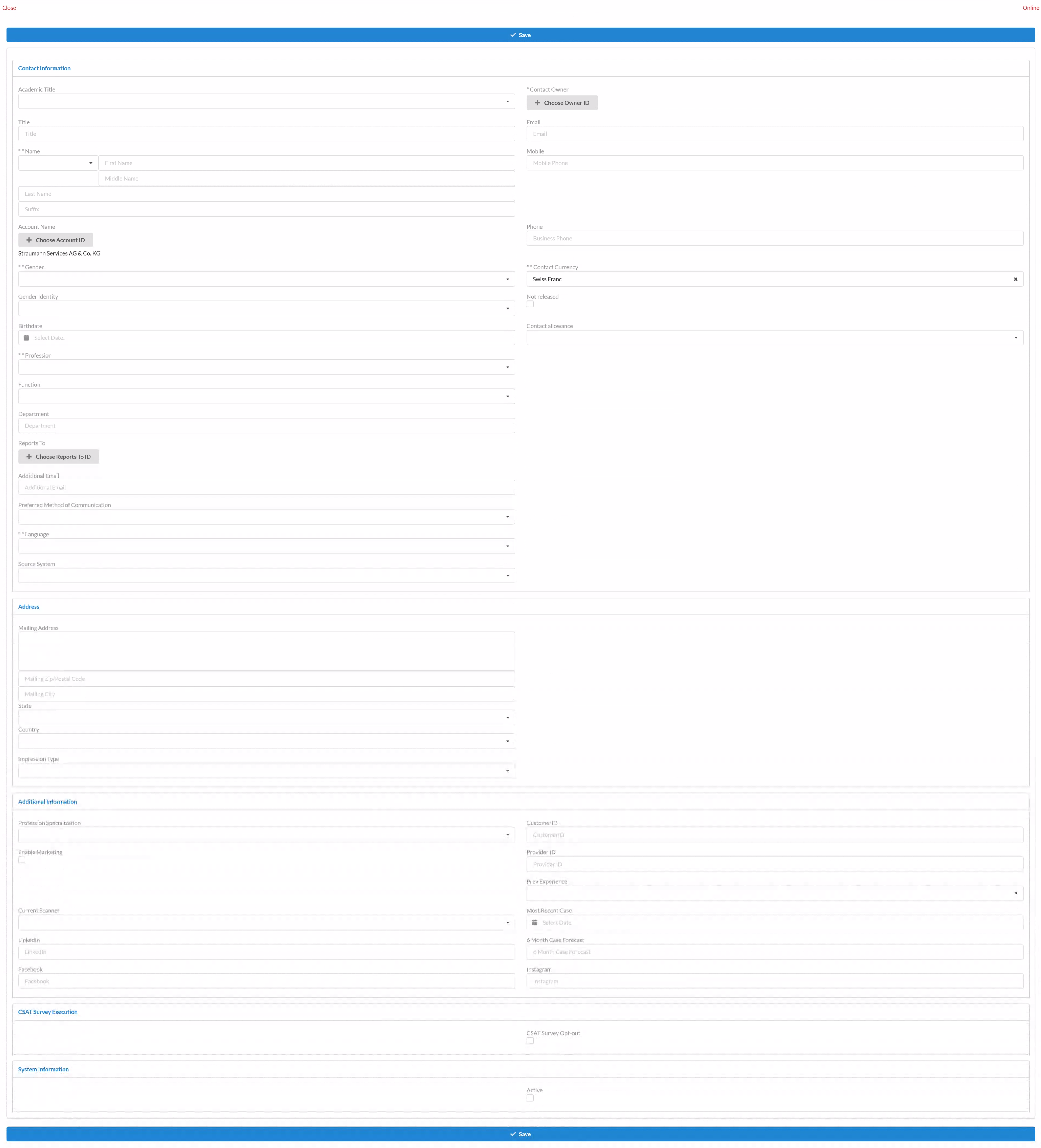 To create new contacts when starting calls, click the Create New button and select Contact. The New Contact form displays.