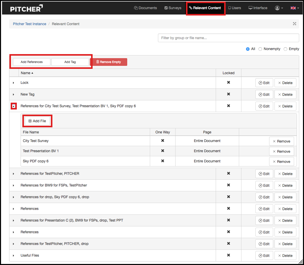Delete: Deletes a tag or reference one by one, or remove all references / tags that do not have any files added to them by clicking on 'Remove Empty'.