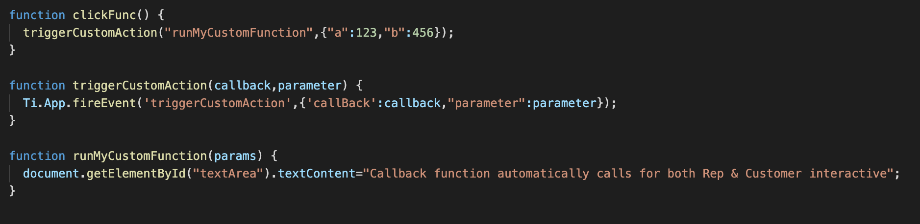 Ti.App.fireEvent('triggerCustomAction',{'callBack':callback,"parameter":parameter});