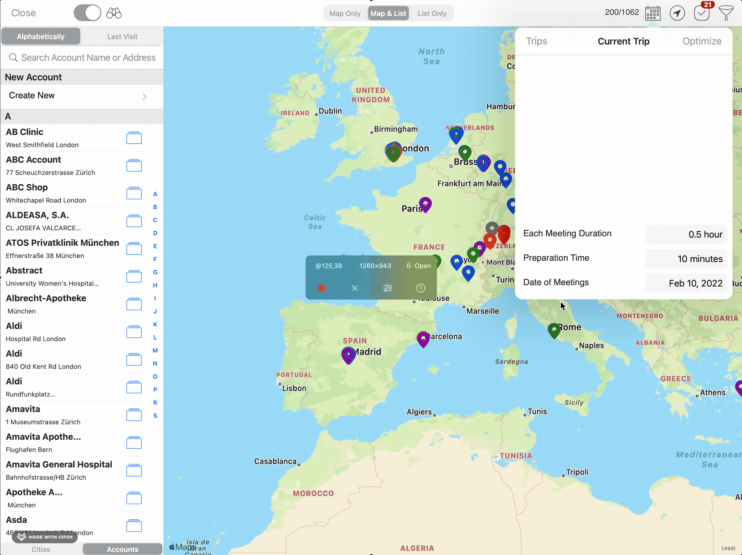 In order to optimize the route, user has to select at least one account and tap the Optimize button in the top right corner of the popover window.