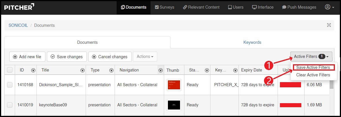 This page will give a walkthrough on how to search and filter documents from a large library of files in Pitcher Admin. These filters can be selected and saved which makes it easy to filter documents rather than selecting the filters again and again.