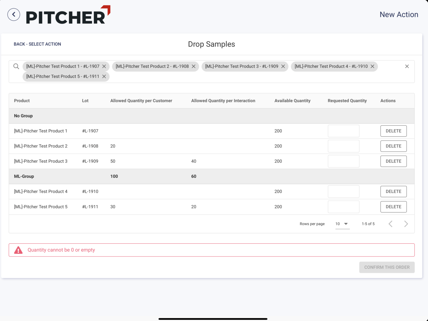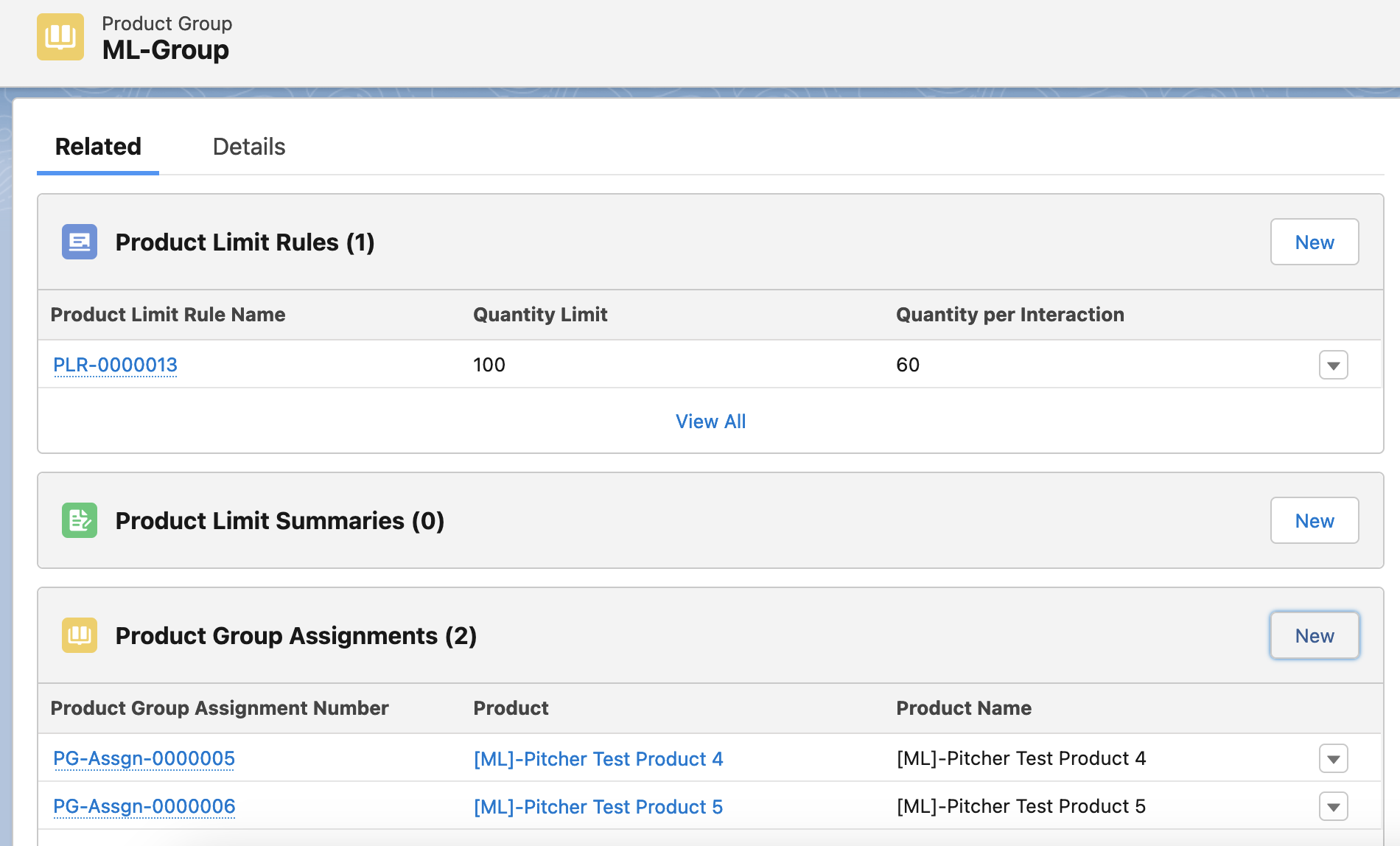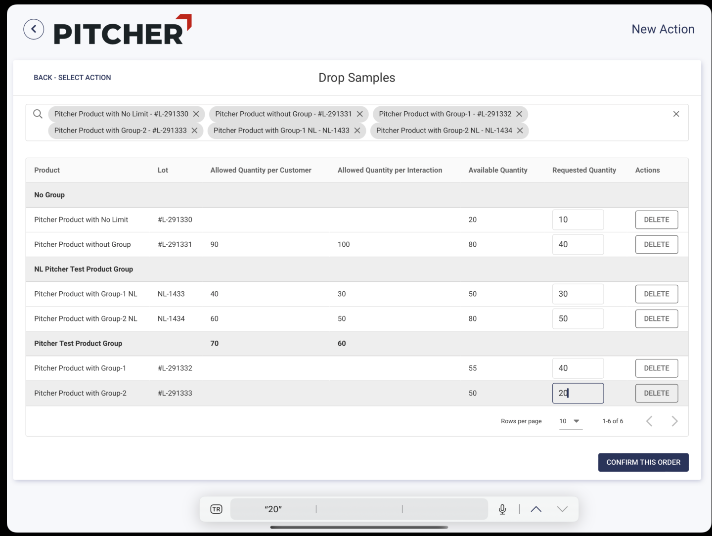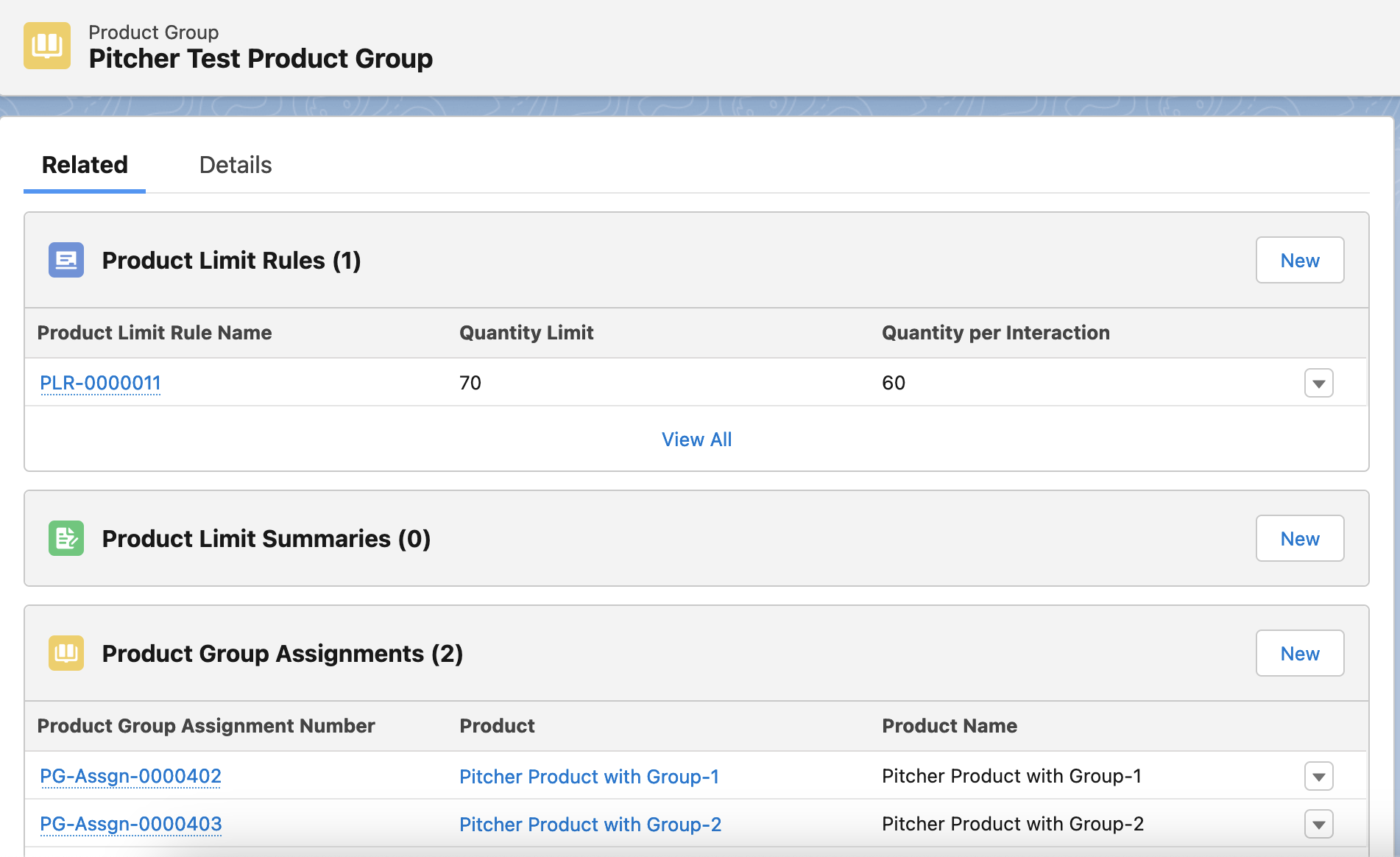 [ML]-Pitcher Test Product 1: Since product does not have any limitation, rep can drop to available quantity (200)[ML]-Pitcher Test Product 2: Product has limit value 20 per customer, so maximum quantity can be dropped is 20[ML]-Pitcher Test Product 3: Product has limit value 50 per customer and 40 per interaction, so maximum quantity can be dropped is 40[ML]-Pitcher Test Product 4: Product does not have any limitation defined to product but it belongs to a group where limits are 100 per customer and 60 per interaction, so maximum quantity per this group (total quantity being dropped for all products belong to the group) will be 60ML]-Pitcher Test Product 5: Product belongs to same group with #4, but also has it’s own defined limitations. So maximum quantity of this product that can be dropped is 20, and total number of the dropped quantity of this group again cannot be more than 60