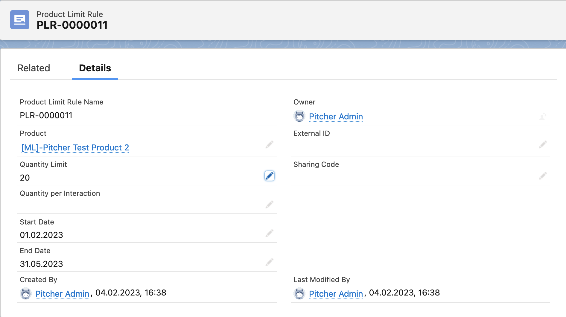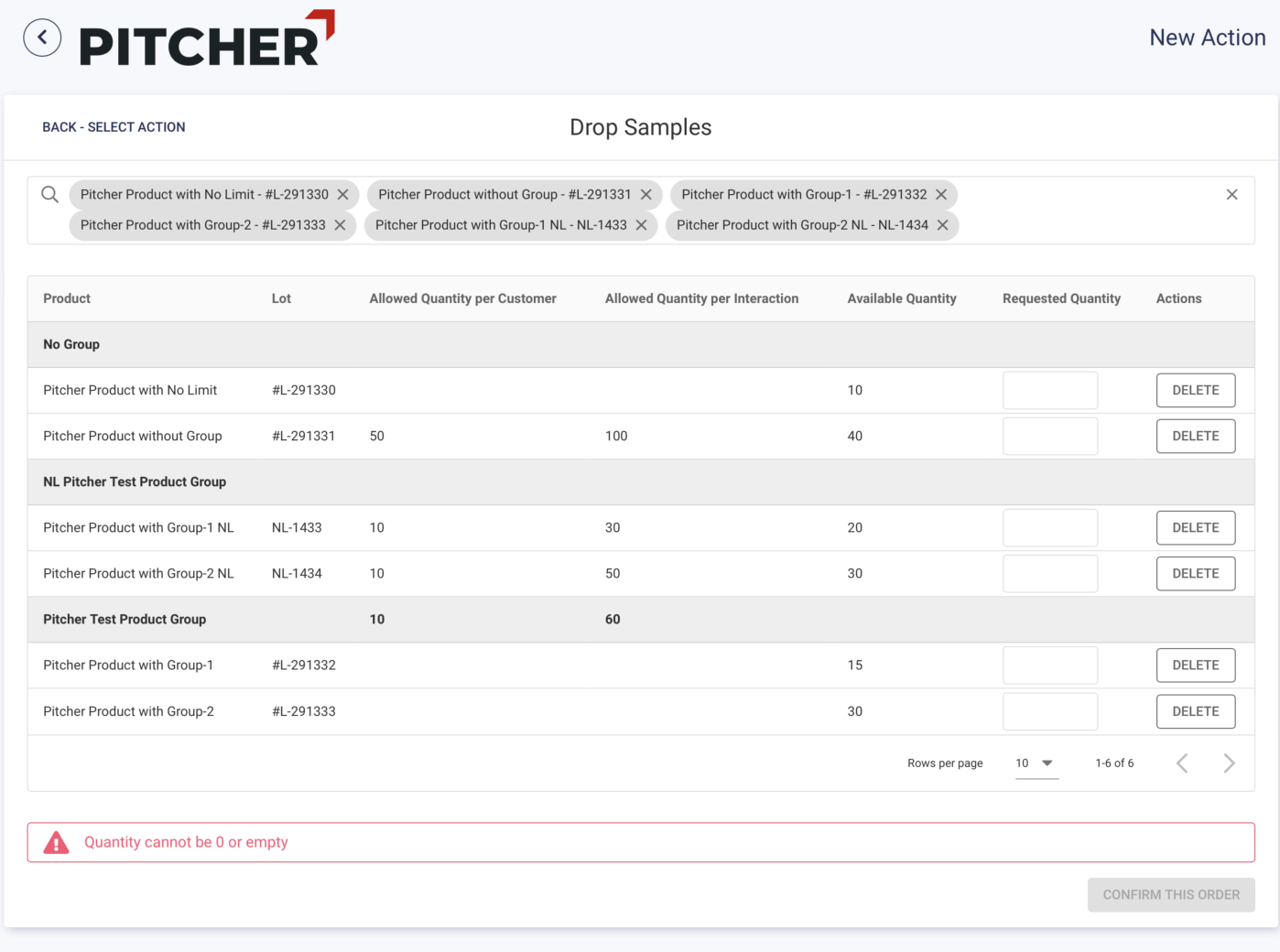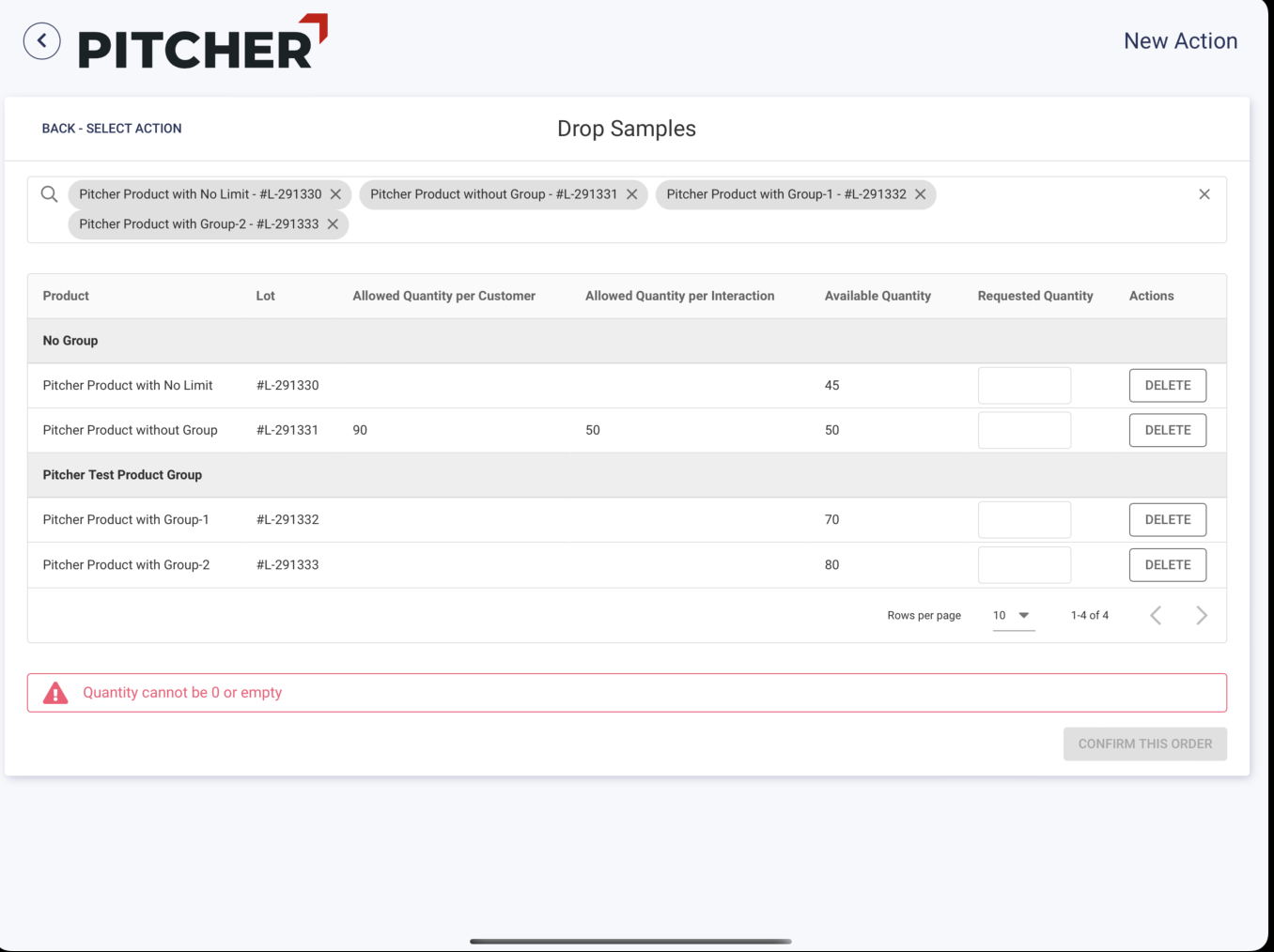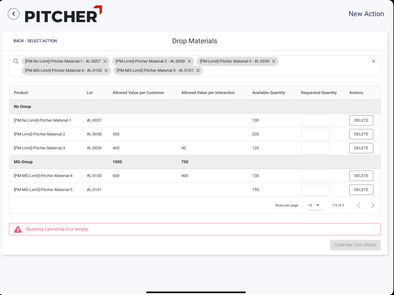 [ML]-Pitcher Test Product 1: Since product does not have any limitation, rep can drop to available quantity (200)[ML]-Pitcher Test Product 2: Product has limit value 20 per customer, so maximum quantity can be dropped is 20[ML]-Pitcher Test Product 3: Product has limit value 50 per customer and 40 per interaction, so maximum quantity can be dropped is 40[ML]-Pitcher Test Product 4: Product does not have any limitation defined to product but it belongs to a group where limits are 100 per customer and 60 per interaction, so maximum quantity per this group (total quantity being dropped for all products belong to the group) will be 60ML]-Pitcher Test Product 5: Product belongs to same group with #4, but also has it’s own defined limitations. So maximum quantity of this product that can be dropped is 20, and total number of the dropped quantity of this group again cannot be more than 60