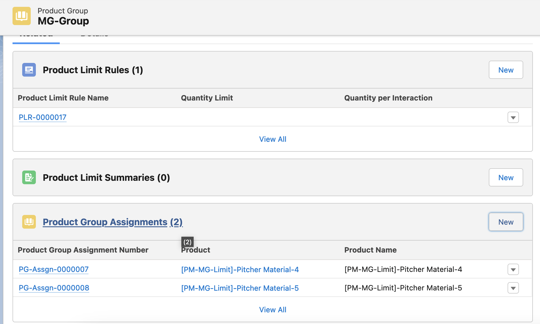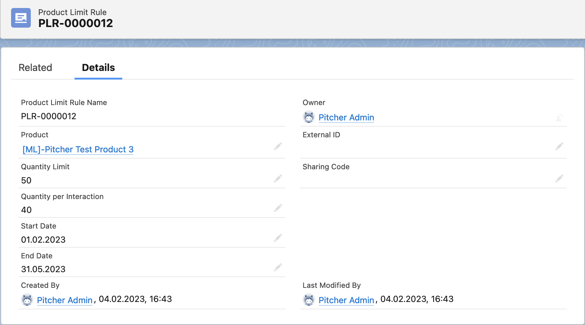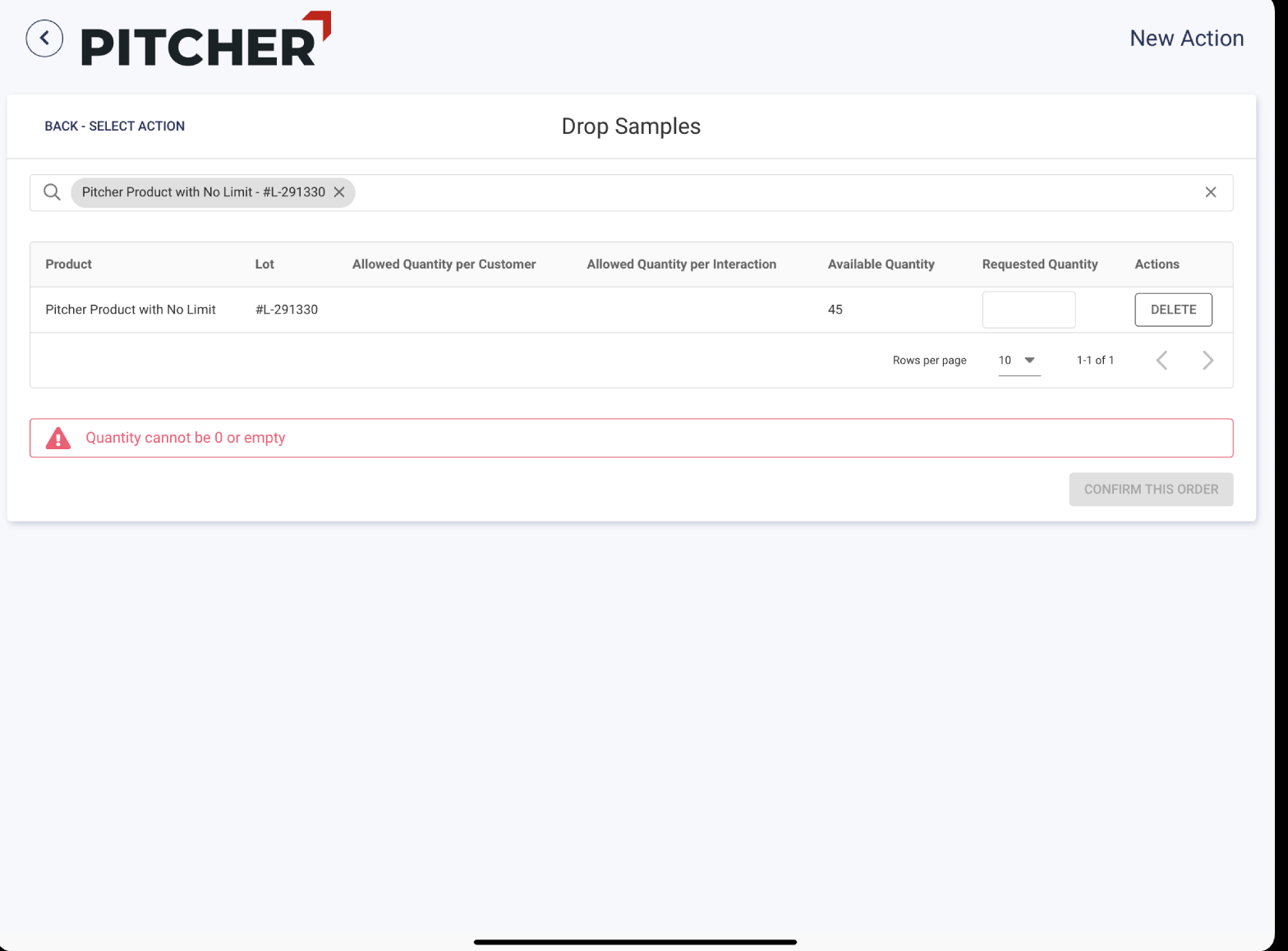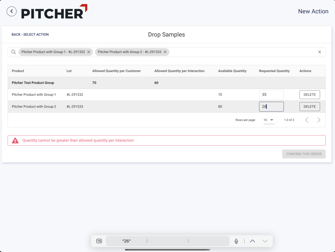 [ML]-Pitcher Test Product 1: Since product does not have any limitation, rep can drop to available quantity (200)[ML]-Pitcher Test Product 2: Product has limit value 20 per customer, so maximum quantity can be dropped is 20[ML]-Pitcher Test Product 3: Product has limit value 50 per customer and 40 per interaction, so maximum quantity can be dropped is 40[ML]-Pitcher Test Product 4: Product does not have any limitation defined to product but it belongs to a group where limits are 100 per customer and 60 per interaction, so maximum quantity per this group (total quantity being dropped for all products belong to the group) will be 60ML]-Pitcher Test Product 5: Product belongs to same group with #4, but also has it’s own defined limitations. So maximum quantity of this product that can be dropped is 20, and total number of the dropped quantity of this group again cannot be more than 60