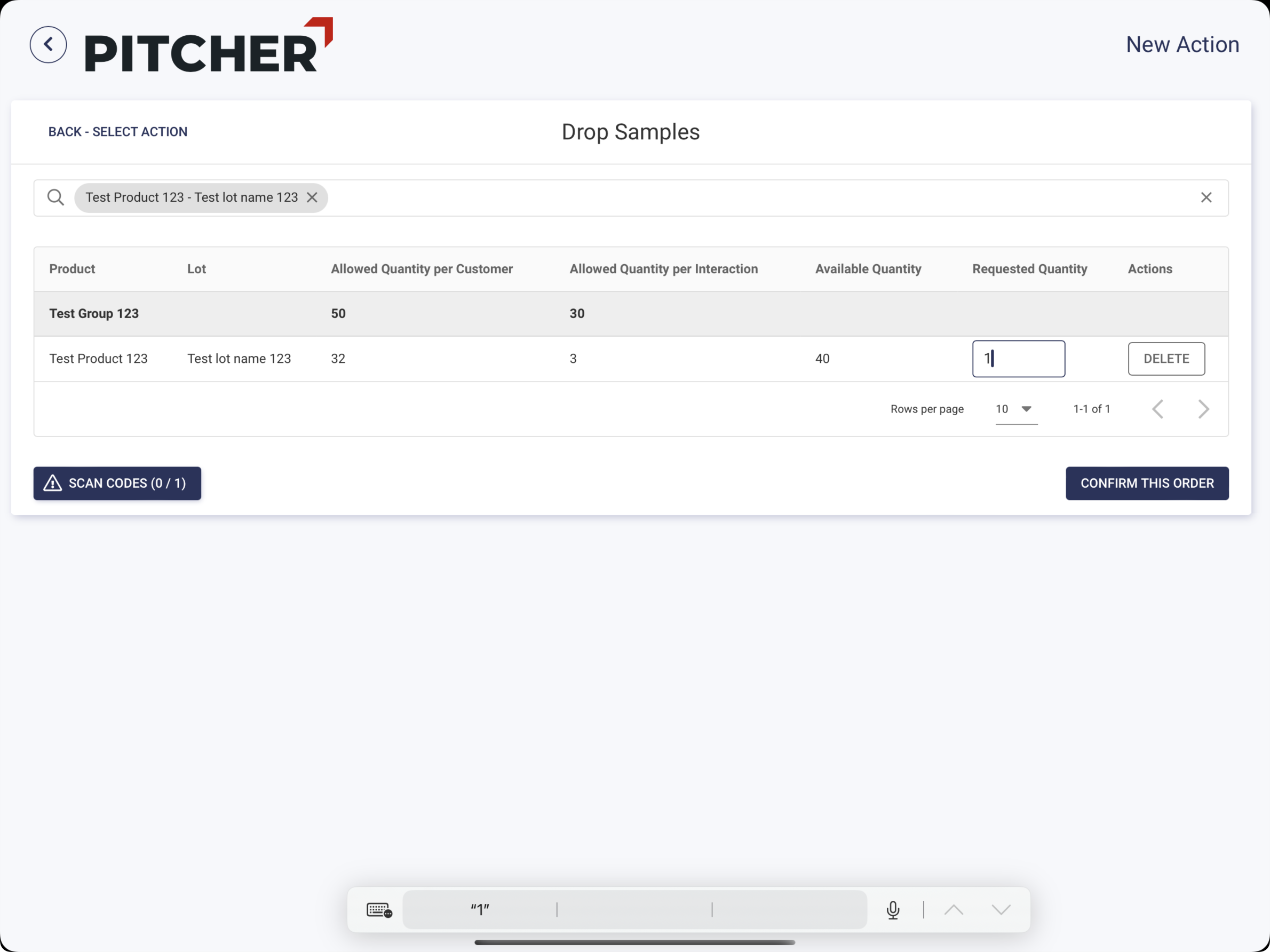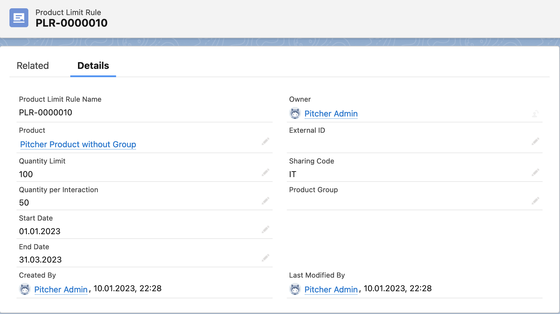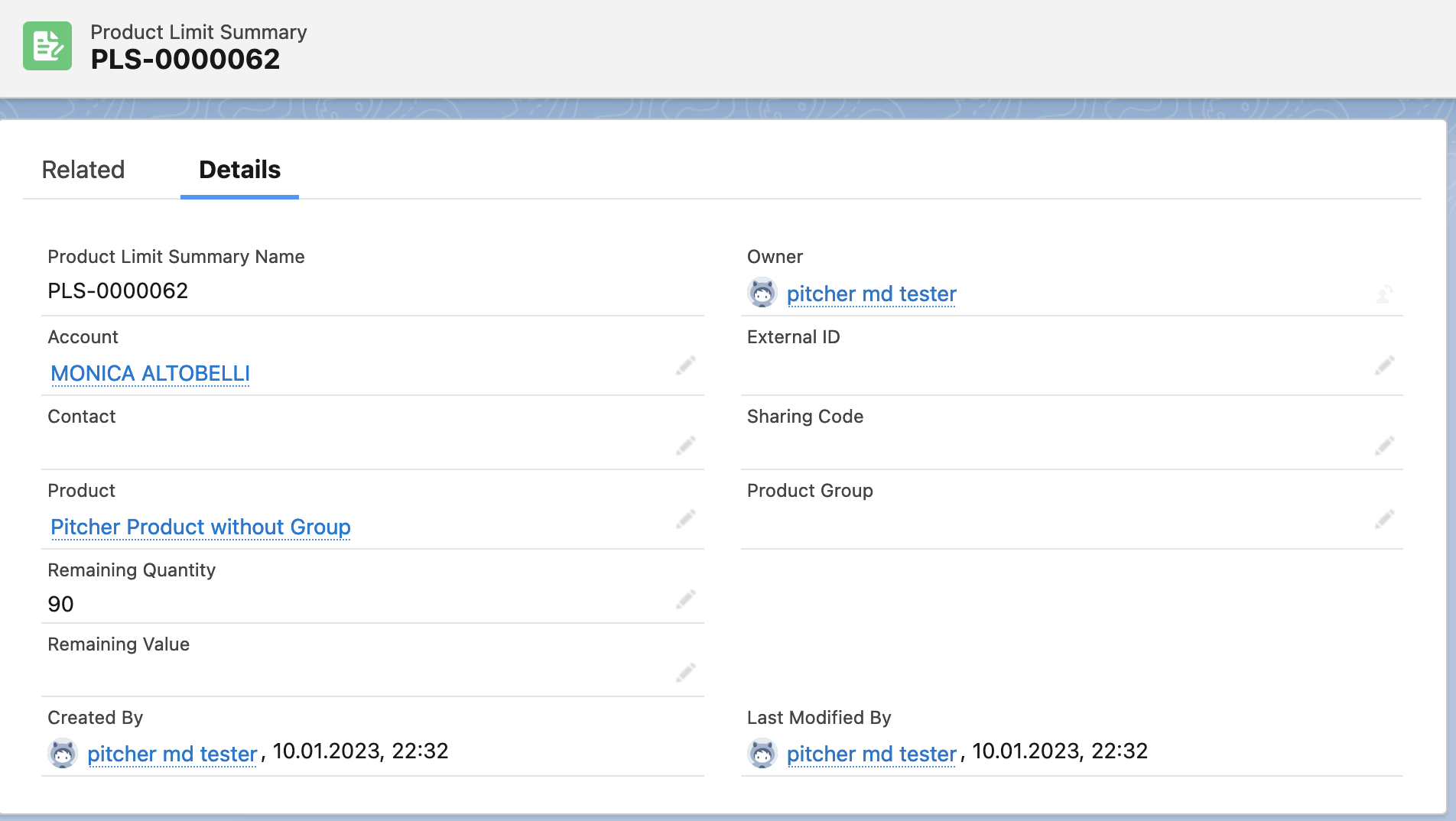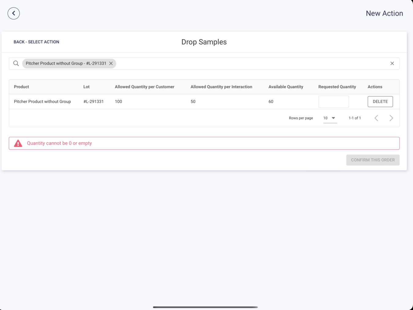[ML]-Pitcher Test Product 1: Since product does not have any limitation, rep can drop to available quantity (200)[ML]-Pitcher Test Product 2: Product has limit value 20 per customer, so maximum quantity can be dropped is 20[ML]-Pitcher Test Product 3: Product has limit value 50 per customer and 40 per interaction, so maximum quantity can be dropped is 40[ML]-Pitcher Test Product 4: Product does not have any limitation defined to product but it belongs to a group where limits are 100 per customer and 60 per interaction, so maximum quantity per this group (total quantity being dropped for all products belong to the group) will be 60ML]-Pitcher Test Product 5: Product belongs to same group with #4, but also has it’s own defined limitations. So maximum quantity of this product that can be dropped is 20, and total number of the dropped quantity of this group again cannot be more than 60