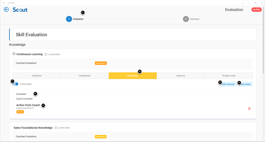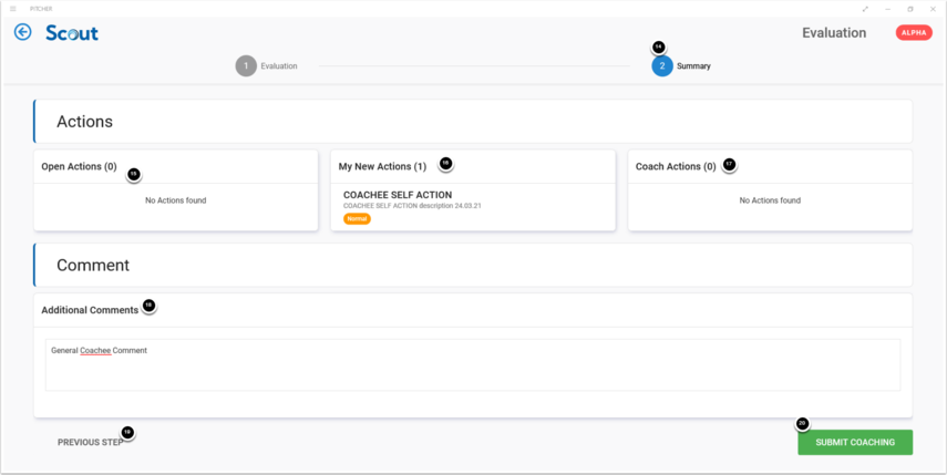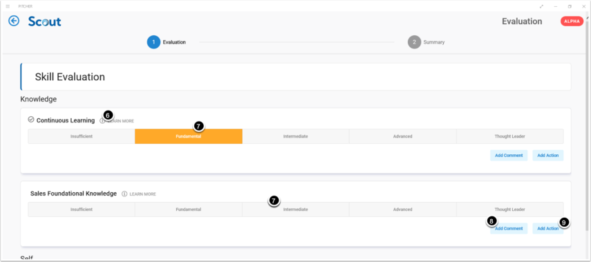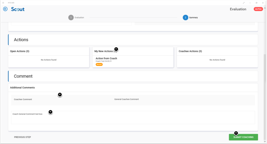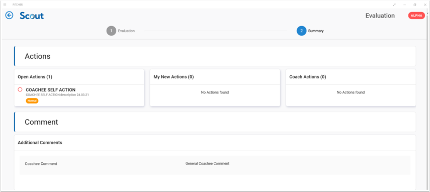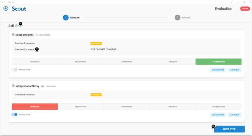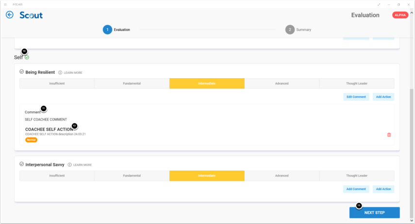 In this step, a Coachee performs a self-skill evaluation and adds any Coachee actions and comments as required.