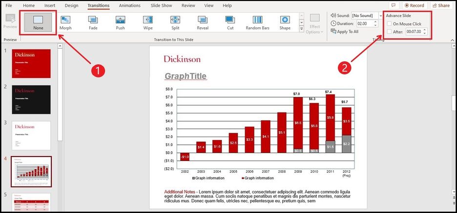 To remove transitions from the presentation follow these steps: