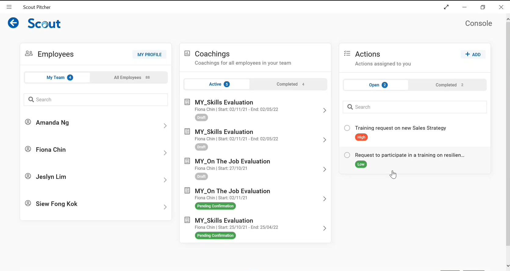 The “Actions” card lists all actions assigned to you by your employees (coachees).