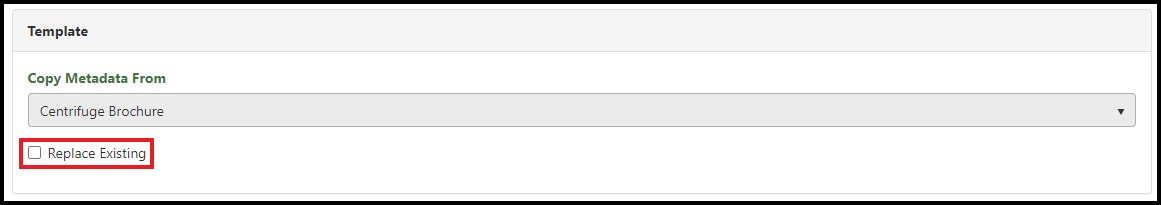 Copy Metadata From - This allows you to upload a file and copy the Metadata (Hotspots, references, keywords and navigation) from an already uploaded file in Pitcher Web Admin. Upon selecting a document from dropdown a checkbox will appear. By checking the box "Replace Existing" the newly uploaded file will replace the selected existing file (removed from Pitcher Web Admin).