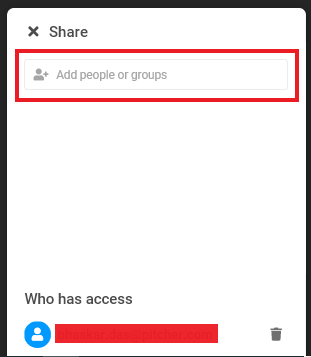 2. In the dialog that appears type email of the team member you want to share the file with. You can also see the user who has access to the file. If you want to remove access click the delete icon on the right side of the user.