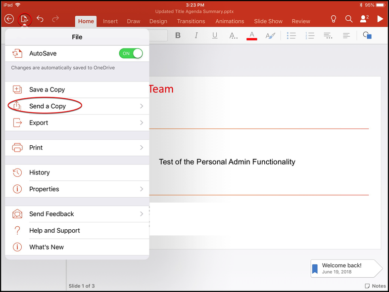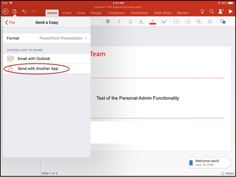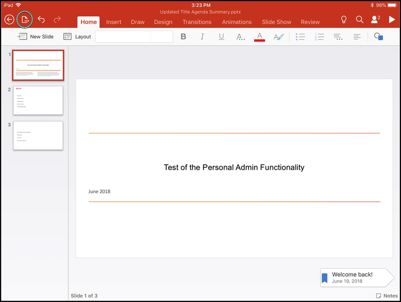 Let’s learn how to upload files from Microsoft PowerPoint to Pitcher Personal Admin. This page provides walkthrough on how to edit a file in Microsoft PowerPoint and upload using Pitcher PA application in iPad.