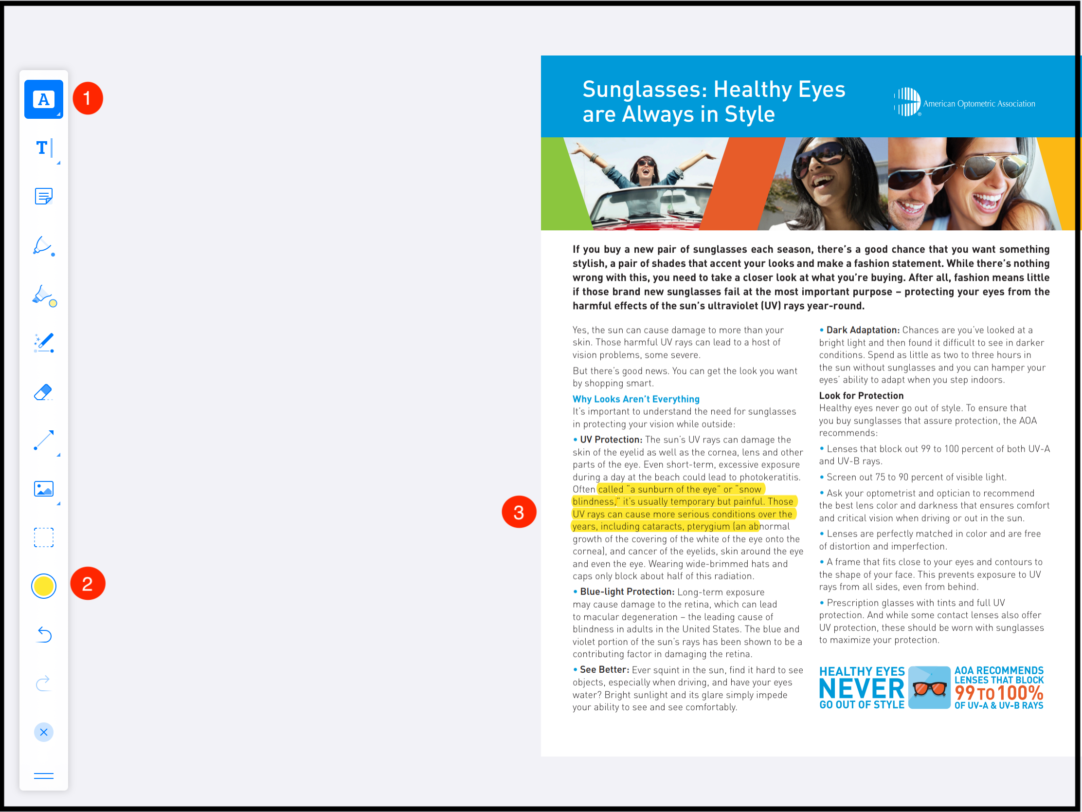 This tool allows the user to apply freeform highlight in the pages unlike text highlighter where you have to select the text, this tool allows you to highlight any spot in the page.