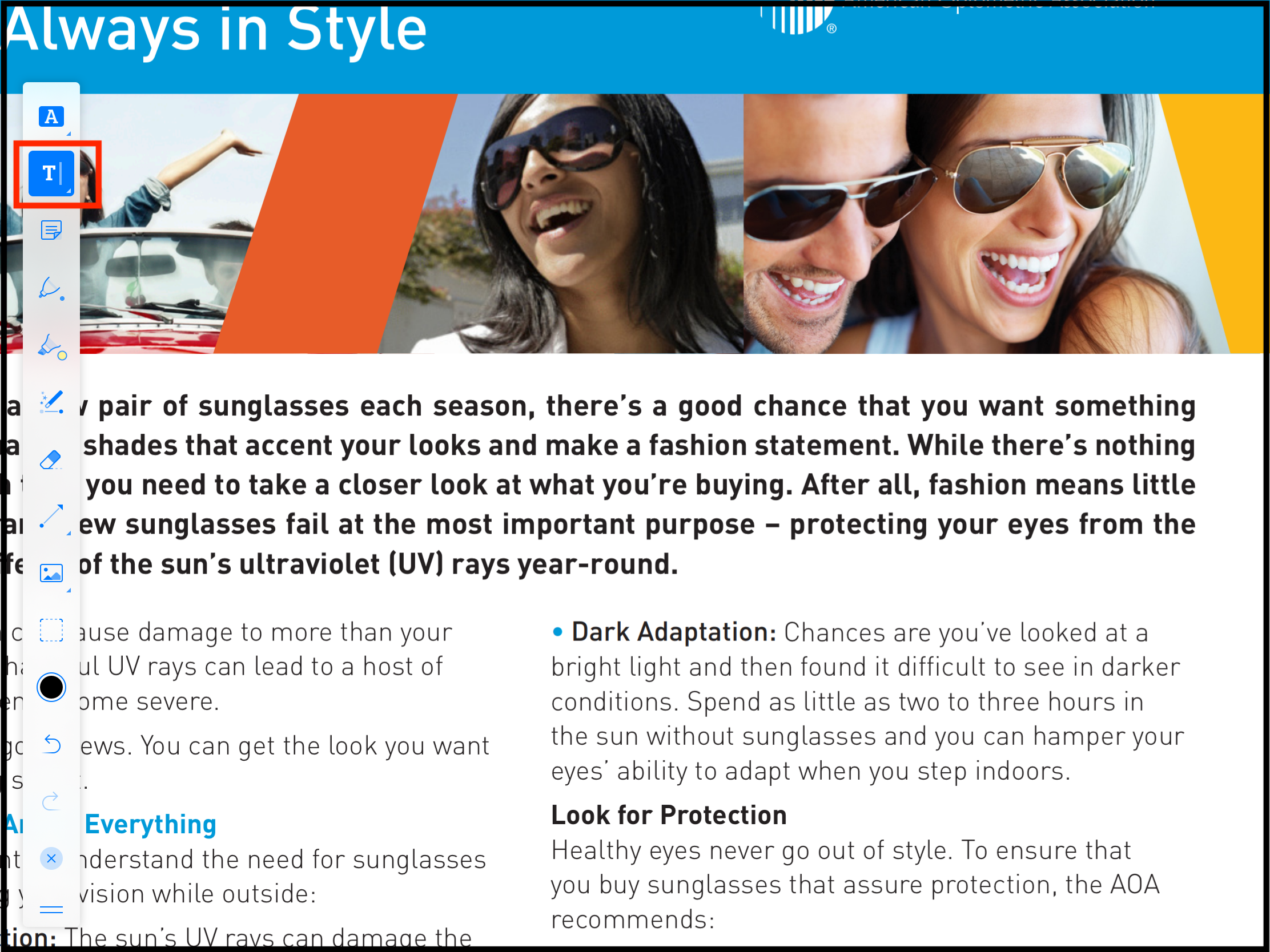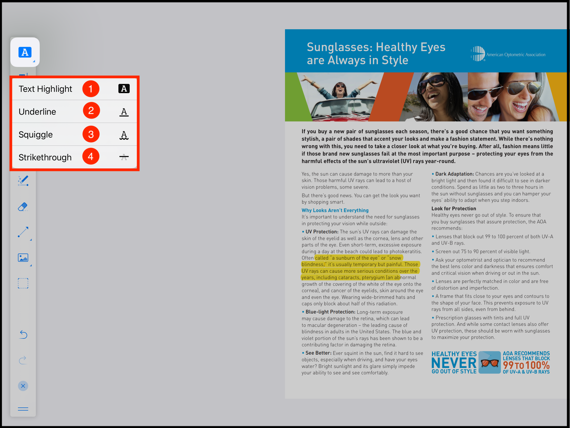The first tool in the annotations toolbar can be used to highlight, underline, strikeout and squiggle the text.