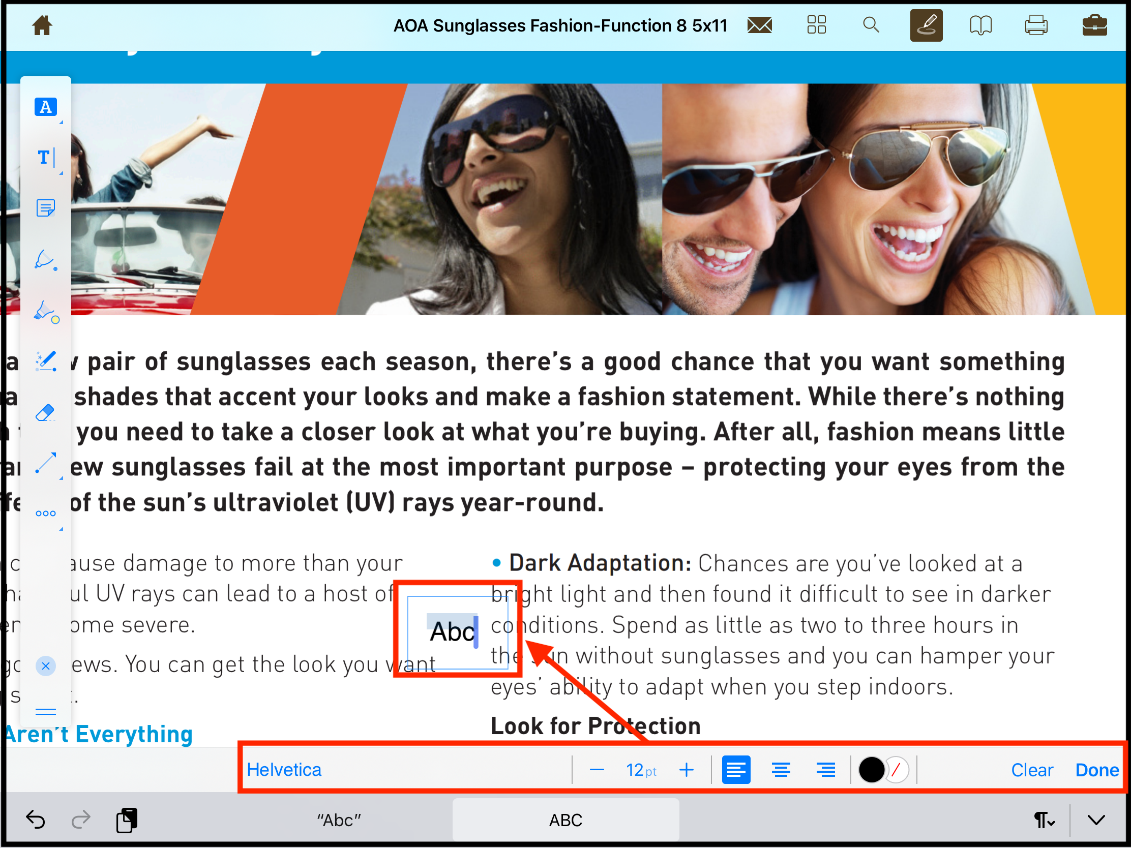 Tap anywhere in the page where you want to add text. A small square box will appear that will allow you to add text. Along with the box, text editing tools will also be activated which can be used to format the text.