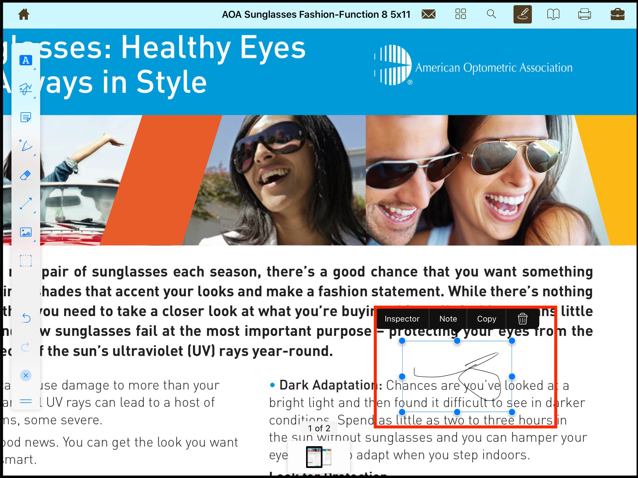 The signature box can be placed at the desired location within the page by dragging and dropping it. It also allows user to edit the details using inspector, add note, copy signature and delete the signature.