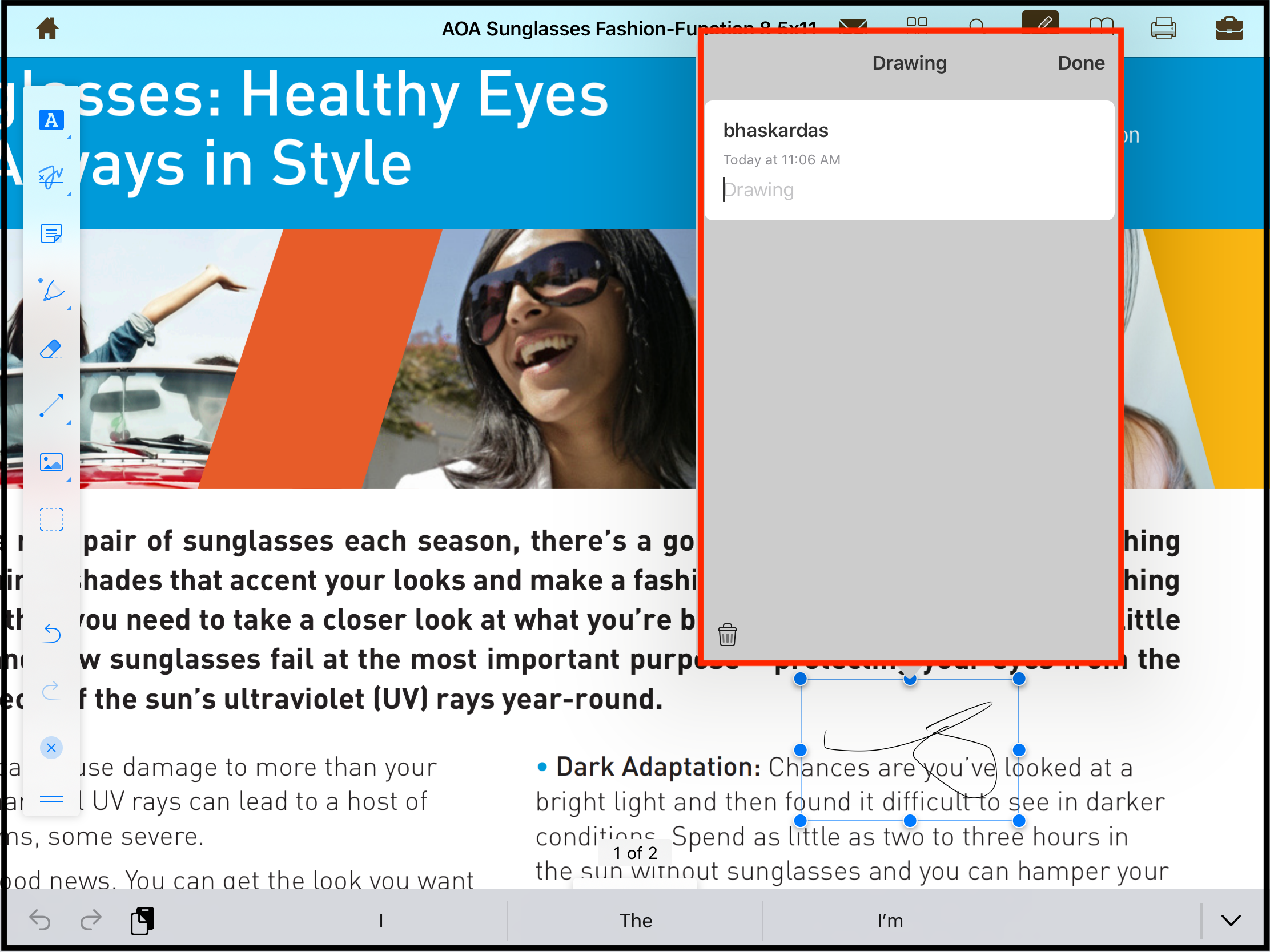 To edit and remove the drawing, tap anywhere near the drawing area and a box will appear with various options.