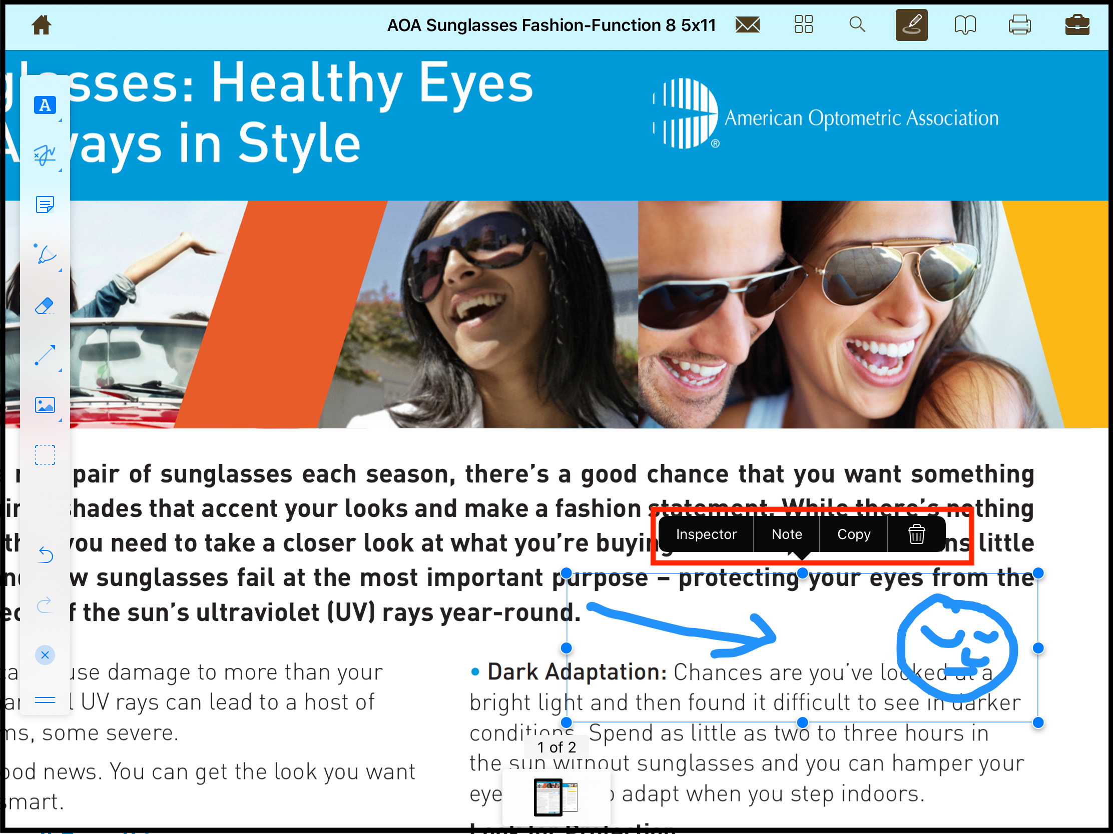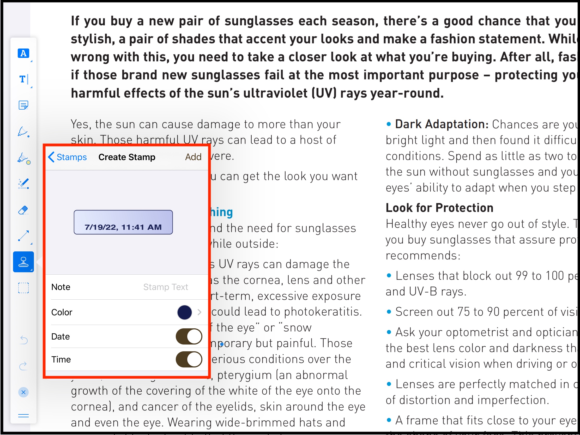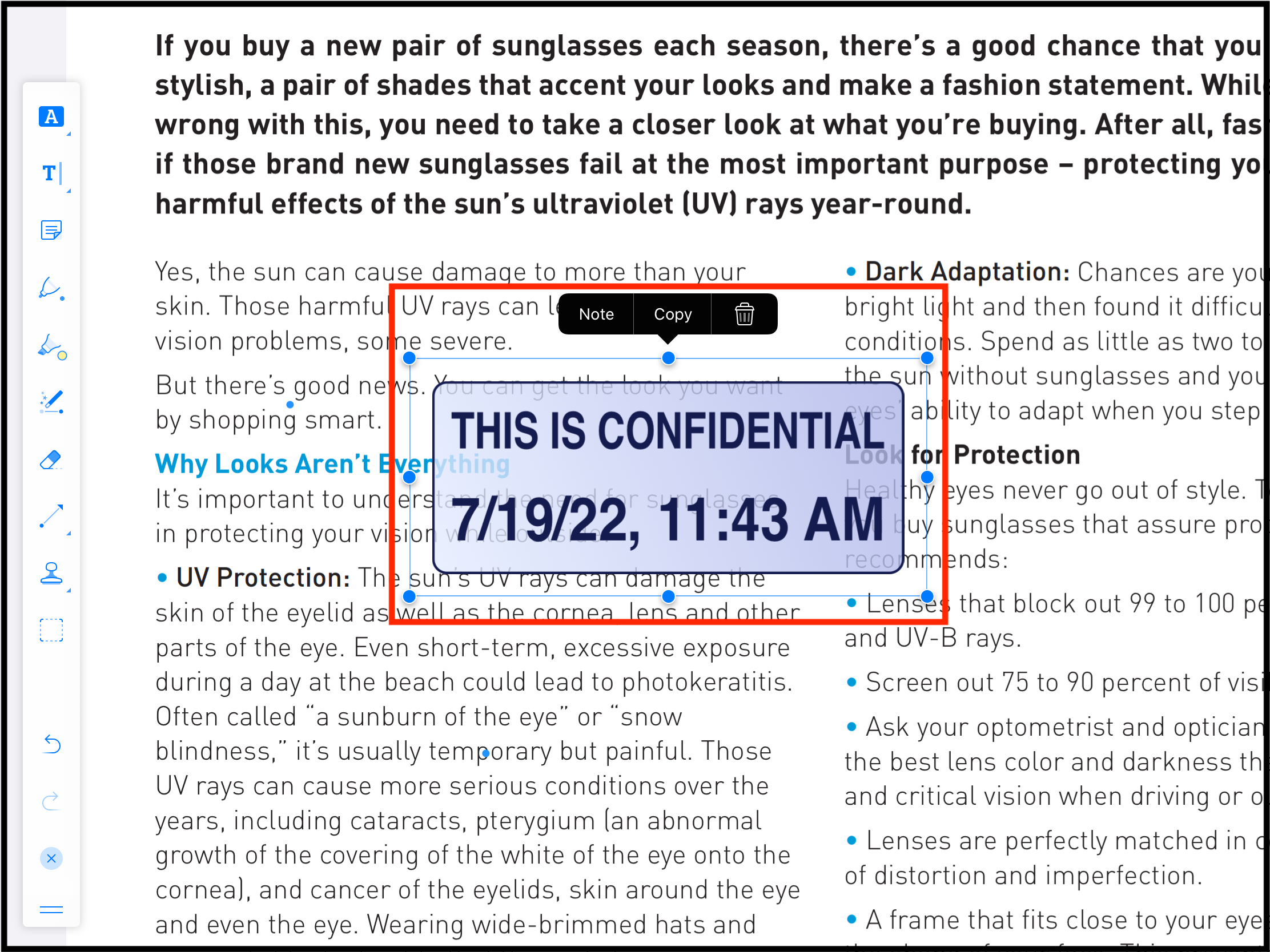 After the stamp is added on the desired spot in the PDF page, the user can add note, copy or delete the stamp. A single tap anywhere in the page would remove the editable boundaries around the stamp.
