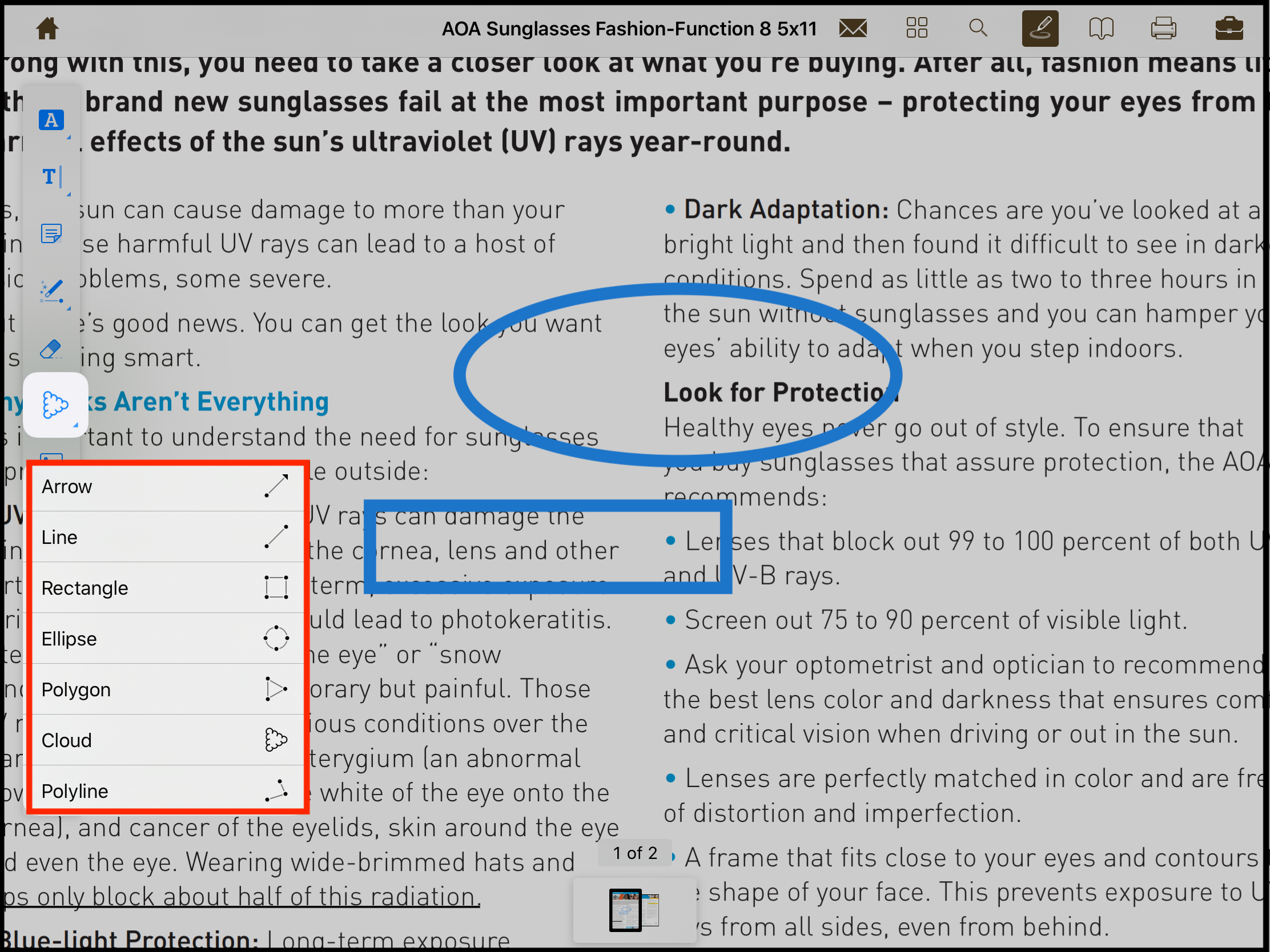 With this tool the user can create arrow, Ellipse, Rectangle, Line, Polyline, Polygon, cloud. Long tap on the desired tool and then tap on the desired spot in the page to generate the shape.