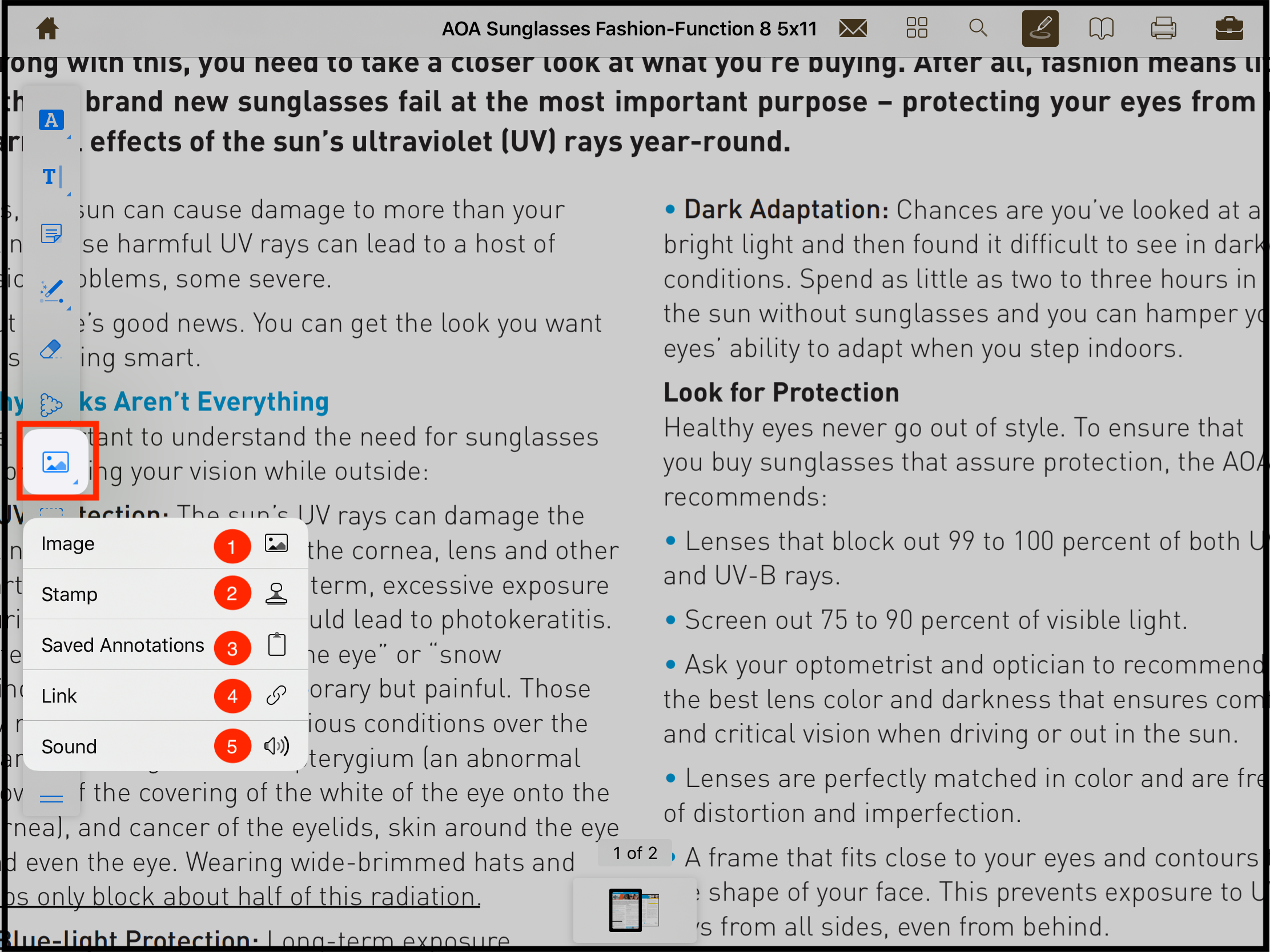 This tool offers the user to add image, stamp, check saved annotations, add link to the text, add recorded audio to the text.