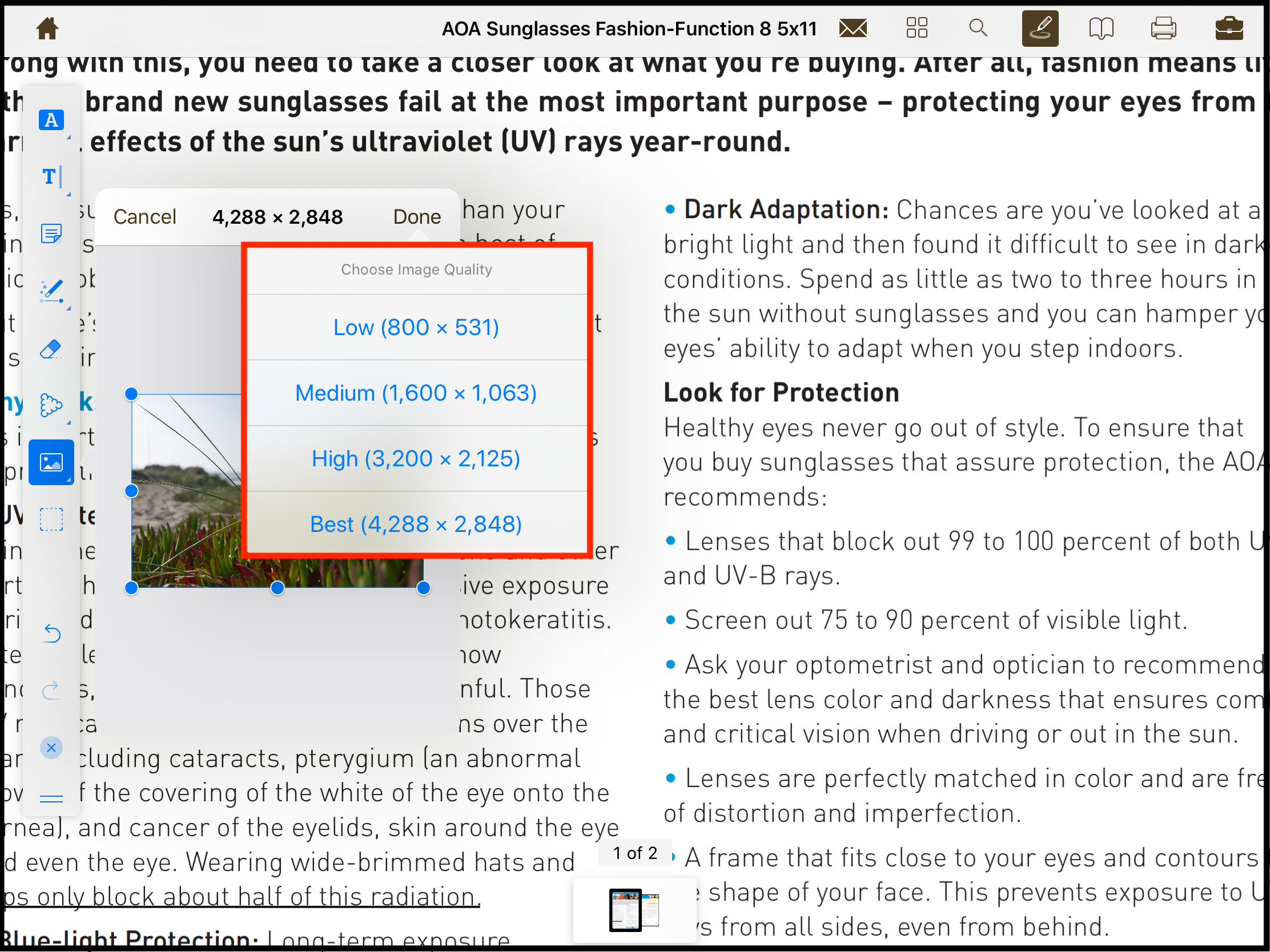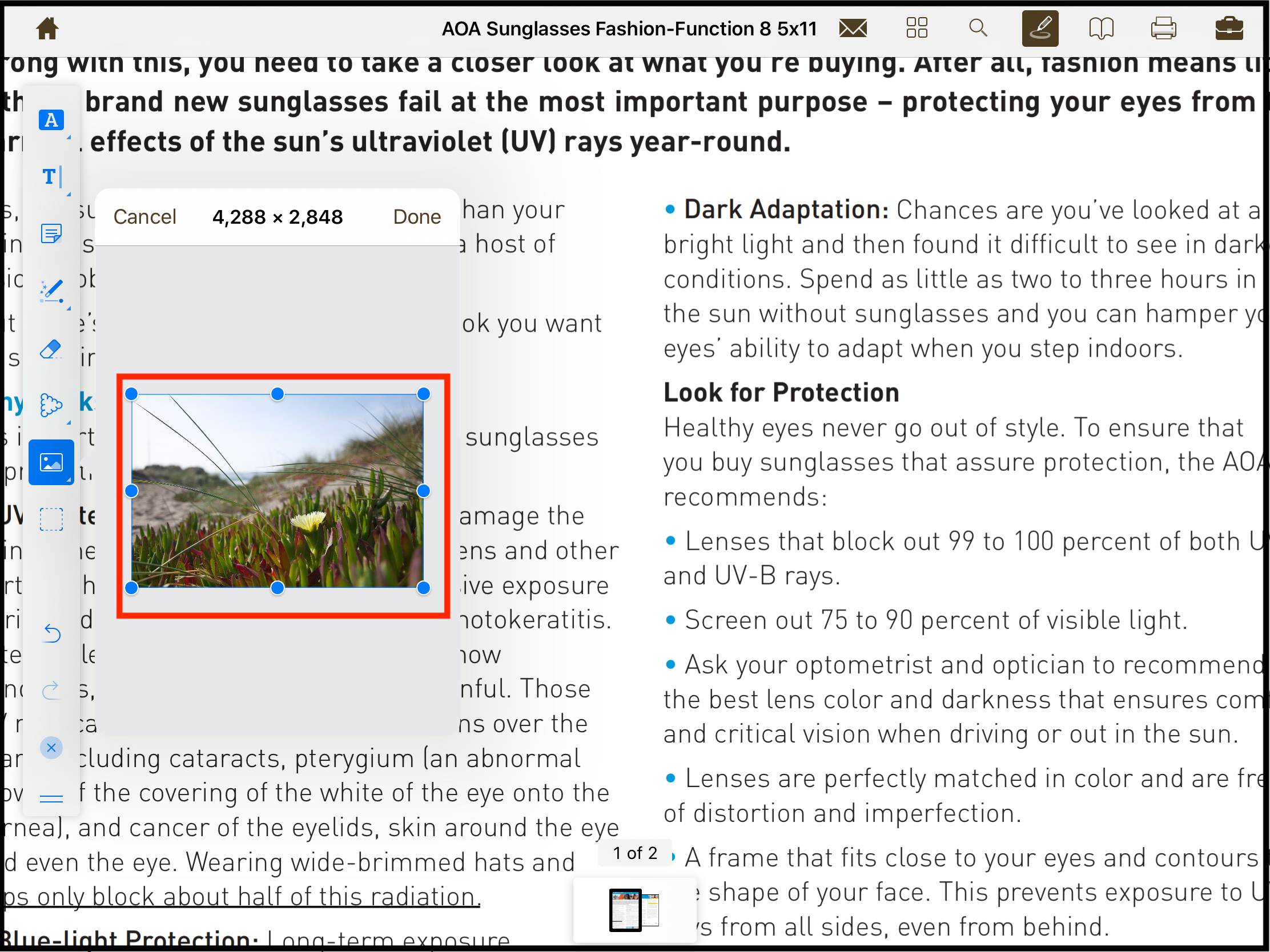 Size of the image can be adjusted by dragging the marked boundary around the image. Alternatively, Done button will allow the user to select one of the sizes as shown below.