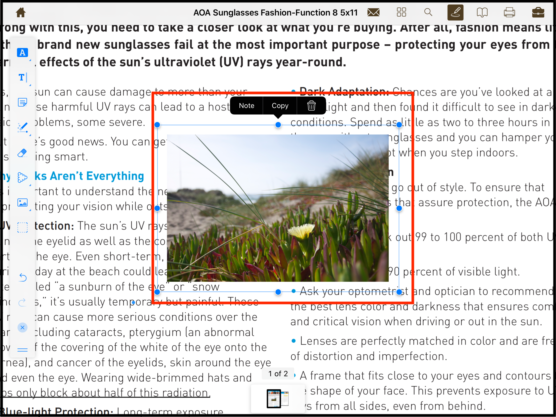 The image will be placed on the PDF page and will allow the user to add a note, copy and delete image. Further, image size can be reset by dragging the boundaries here as well as shown below.