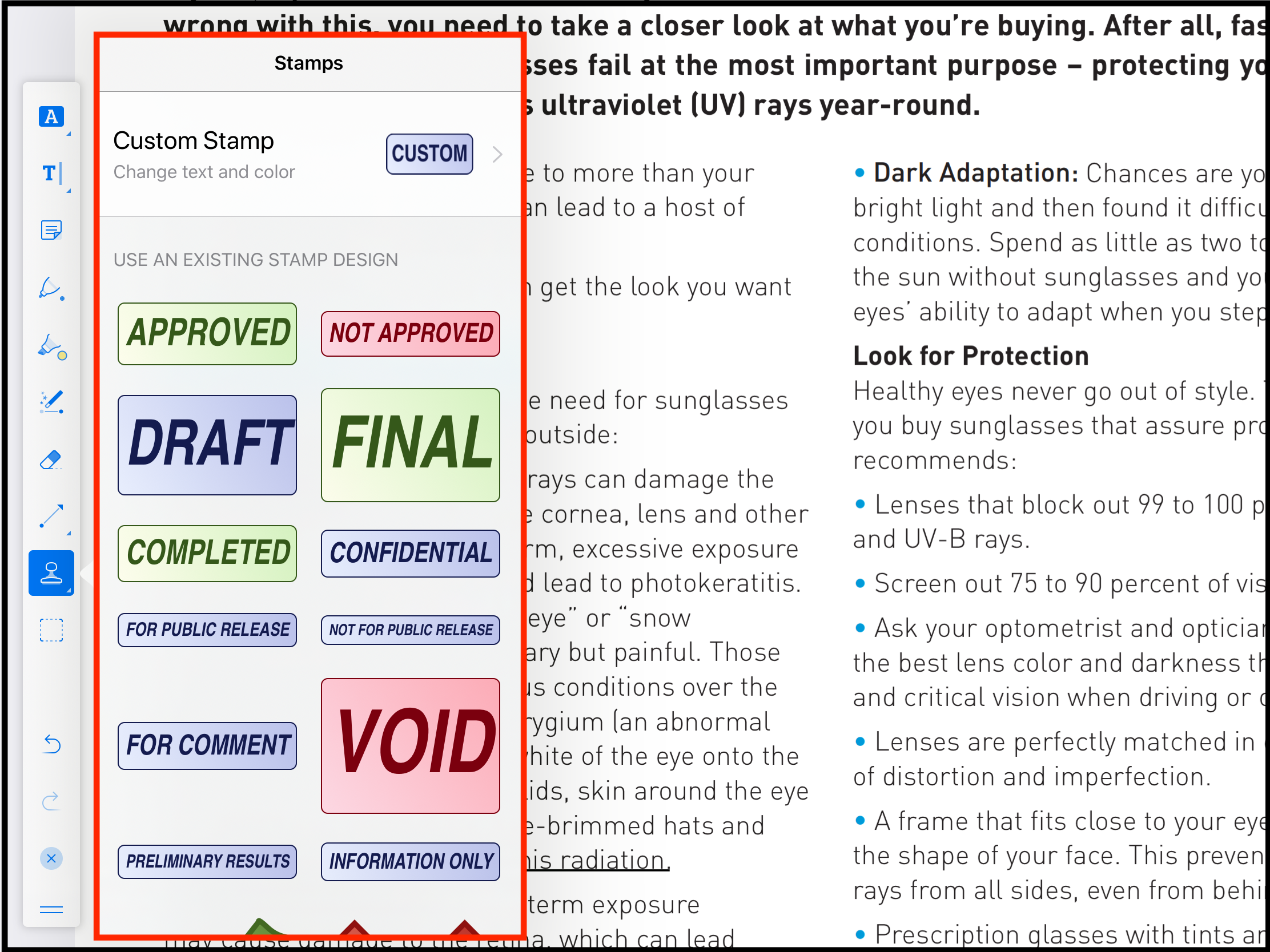Stamp Tool allows the user to add stamp to the PDF Page. Simply long tap the image tool and select stamp tool.