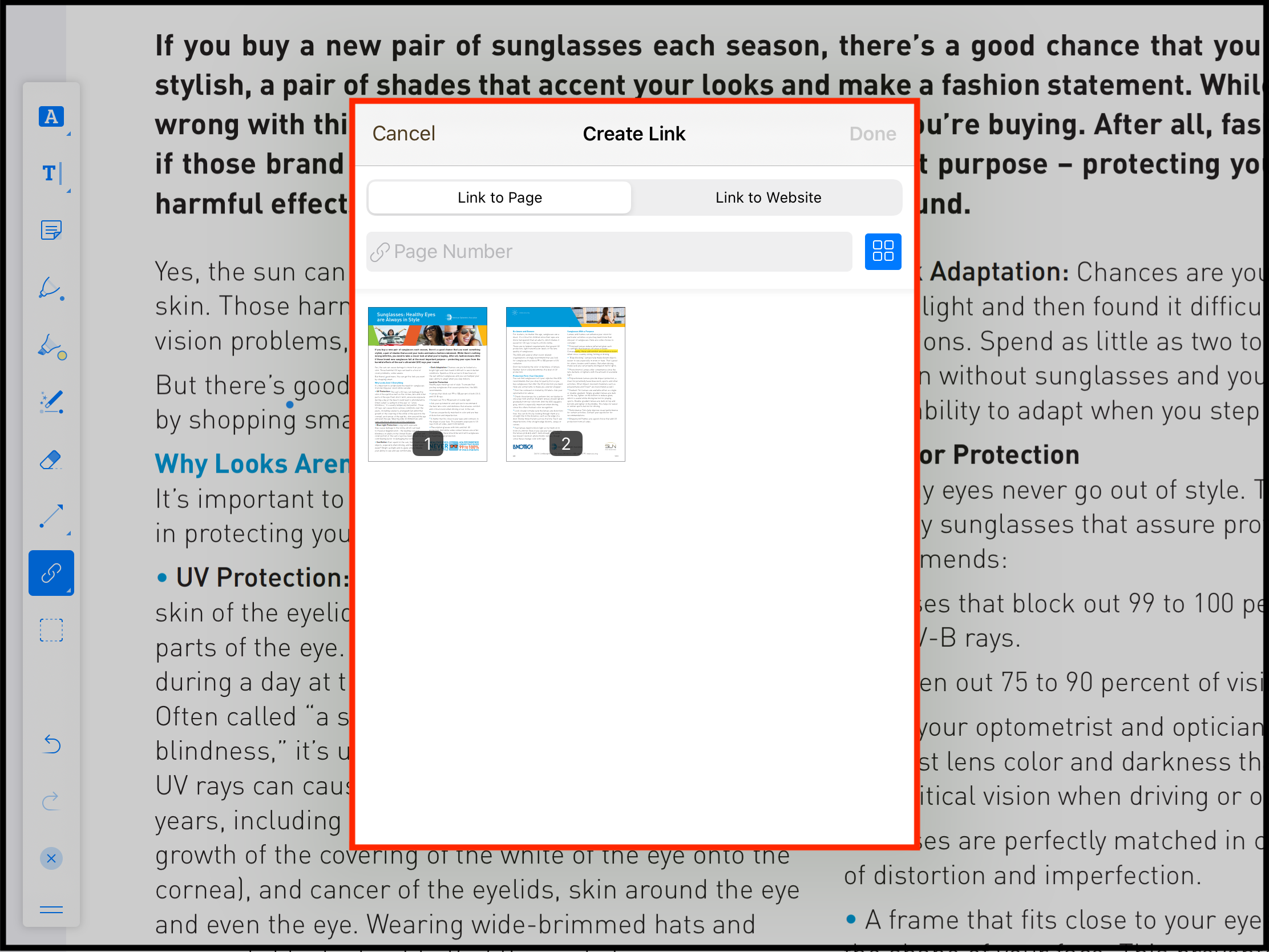A link can be a web page link or link to another page. This tool allows user to add link in the PDF Page. To use the tool long tap on the image tool and then select the link tool.
